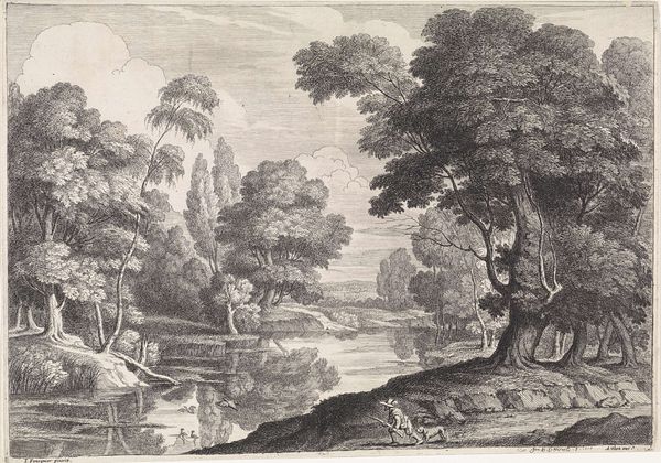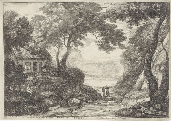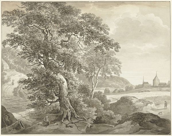 Curator: This etching from 1774, entitled "Figuren bij een schuit in een berglandschap," is by Anthonij van der Haer. It shows figures near a boat in a mountainous landscape. Editor: It’s immediately striking— the light and shadow create such a dramatic scene. Almost theatrical, wouldn’t you say? The detailed figures feel as though they are a part of a staged composition within a sublime landscape. Curator: Indeed. Van der Haer was working in a period that idealized the pastoral, but through a very specific lens. The late 18th century was witnessing the birth of modern tourism, and the demand for picturesque scenes and landscapes fueled artistic production. This etching aligns with the tastes of the wealthy elite. Editor: You can really see the idealized representation you're talking about. Note how these working figures are peacefully framed, without the suggestion of true labor. It almost romanticizes their existence in a very detached, privileged way. The picturesque framing is the main agenda of this type of art. Curator: Precisely. These prints were made to be collected and viewed as beautiful objects, signifying their owner’s refined sensibilities and their connection to nature and classical ideals. Editor: Even the inclusion of those classical architectural ruins! They hint at a glorified past. It definitely adds to this impression of idealized leisure within nature that erases any potential for realistic historical conditions. Curator: Exactly. And in terms of production, the etching process itself allowed for wide dissemination of these images, reinforcing the ideologies and values embedded within the landscape genre across society. Editor: Which, of course, had political and social consequences, impacting how people perceived land use and ownership. Curator: Yes. So, while seemingly benign, works like these reveal much about the social and cultural landscape of the late 18th century and how artistic trends interacted with broader historical and political narratives. Editor: Right, analyzing the layers underneath art's aesthetic appeal can highlight uncomfortable but significant reflections about our culture.