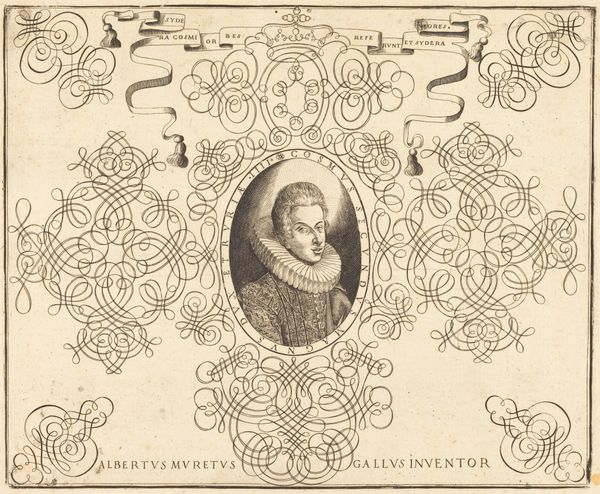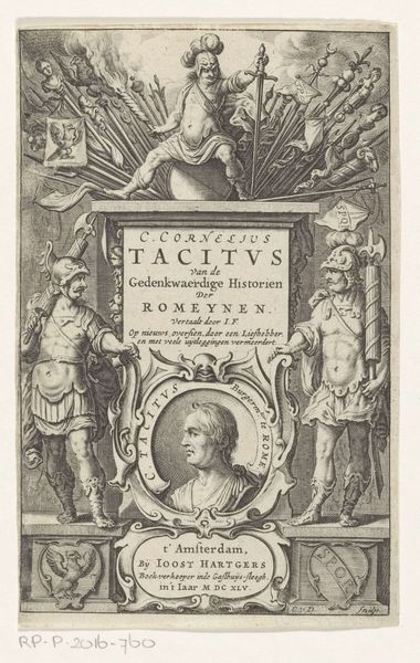 Editor: Here we have "Portret van Timoer Lenk," likely created sometime between 1575 and 1654. It’s an engraving, a print on parchment. There's a stern, almost haunting quality to the figure. What visual aspects stand out to you the most? Curator: What captivates me is how the artist employs visual symbols to communicate power and lineage, despite cultural distance. The portrait's encased in an oval, a traditional framing device. Have you noticed how that frame isn't just decorative but bears inscriptions? Editor: Yes, I see “TARTARORVM IMPERATOR MAGNVS.” Is that intentional? Curator: Precisely. It anchors Timur Lenk—also known as Tamerlane—within a specific historical and cultural context: the Great Tartar, a figure of immense, even legendary, stature in both Western and Eastern historical narratives. The symbolic weight lies in linking his image with an established, though perhaps exoticized, identity. His clothing blends European aristocratic fashion with perhaps imagined “Oriental” motifs. What feeling does that evoke? Editor: A bit… conflicted? He seems to be both familiar and foreign. Curator: The image functions as a form of cultural translation. It makes Timur Lenk knowable to a European audience. Even the historical font is an active carrier, transporting the weight of historical eras into this printed leaf. Note the Dutch text at the bottom too, and imagine this circulating amongst a readership eager for stories of empires, both near and far. Editor: So the print's about presenting a specific version of Timur Lenk, rather than objective representation? Curator: Exactly! It's a tapestry woven with threads of cultural memory, political agenda, and artistic interpretation. Editor: I never considered how much an image like this could actively construct, rather than just reflect, historical understanding.
