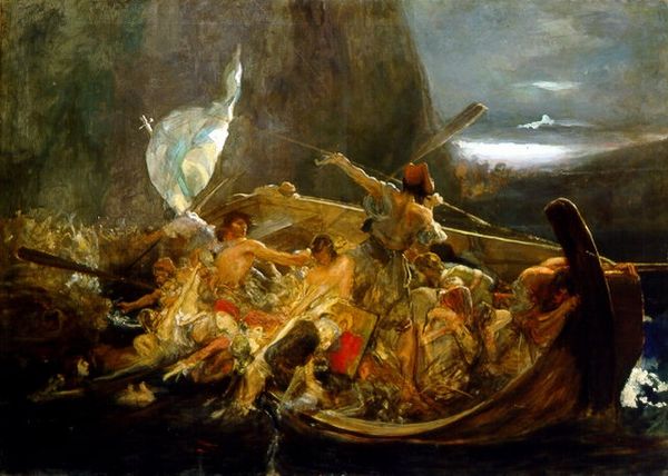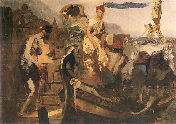 This oil on canvas, "The Funeral of Ruz in Bulgar," was created by Henryk Siemiradzki and is held in the Tretyakov Gallery in Moscow. The painting presents a scene dominated by warm, earthy tones contrasted by patches of cool blues and greens. Notice how Siemiradzki uses broad, energetic brushstrokes to build up a textured surface, giving the scene a sense of dynamic movement amidst the solemnity. The composition is structured around a central funeral pyre, with theBulgar people surrounding it. The artist’s technique here evokes a sense of immediacy, drawing you into the heart of the ritual. The rough application of paint, rather than detracting from the scene, adds to its raw emotional impact. The painting avoids traditional notions of perspective, instead, prioritizing an immersive experience. The overall effect is to challenge fixed narrative interpretations, suggesting a deeper, more visceral engagement with themes of mortality and cultural memory.