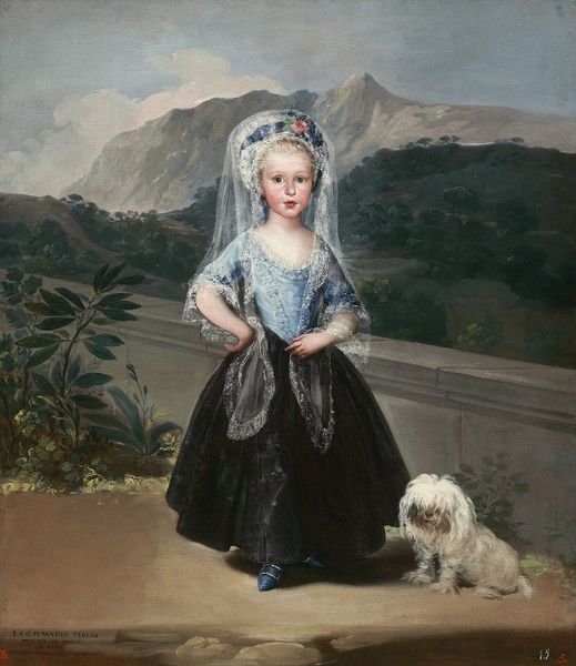 Curator: Here we have Joshua Johnson’s "Letitia Grace McCurdy," an oil on canvas portrait dating to 1802. Editor: My first thought is a somewhat melancholic stillness. The girl's expression and posture, even the dog's expectant gaze, carry a heavy seriousness, don’t you think? Curator: Certainly. And while the painting might appear straightforward, think about the social context of Johnson as one of the first professional African American painters in the United States. The labor of portraiture, usually reserved for the elite, being undertaken by someone of his background... It's significant. Editor: Yes, and considering the symbolism... the little girl in white, perhaps signifying innocence or purity, juxtaposed with the loyal dog—a traditional symbol of fidelity. There's a narrative here about social status and aspirations, isn't there? The red shoes against the muted palette speak to the desire to elevate oneself. Curator: I agree. The materiality reinforces this. Oil paint allowed for a certain level of realism, a polished surface suggesting wealth. Also, the way the red curtain and marble floor suggest the refinement sought through portraiture as status marker. We see the aspiration in this painting. Editor: But there's also an unease to it. Her steady gaze confronts us. She is commanding the relationship with her pet and she expects a kind of subservience reflected in the dog's anticipatory pose. I see control, not exactly comfort or innocence, but power. Curator: The consumption aspect, too. Commissioning a portrait wasn’t cheap, it demonstrates affluence and social standing within the community. Even a rather simply rendered piece such as this underscores McCurdy family's ability to commission one. Editor: I hadn't thought of the composition itself. See how the triangle of figures brings the eye upwards to meet her eyes, while the red drapery on the left acts as a repoussoir and frame, but also echoes her slippers and draws your eyes into the main part of the scene. Curator: An insightful point. What appears simple actually operates on several levels simultaneously. I feel this look offers an understated yet palpable record of an emerging society in transition. Editor: For me, it's about the complexities within the apparent simplicity—the intersection of innocence, status, power dynamics visualized through archetypal figures. I come away wondering how this child interpreted the cultural significance embodied within this single oil painting.