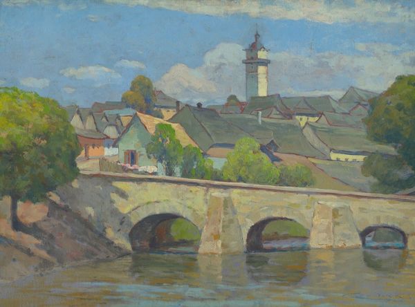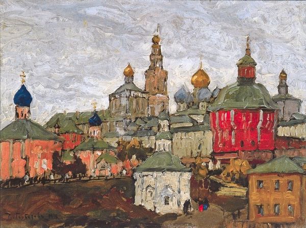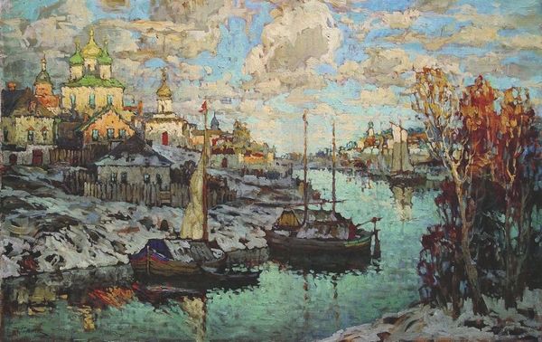 Curator: Let's spend some time with this piece by Konstantin Gorbatov; it's entitled "View of an Old Town." It's rendered in oil on canvas. Editor: Immediately, I am struck by the painting’s atmosphere, a blend of serenity and nostalgia, perhaps tinged with the weight of history embedded in these old structures. Curator: Gorbatov was a part of the Russian avant-garde movement. One could argue this is a scene pregnant with cultural identity, set against a backdrop of significant social upheaval. How do you interpret the symbolism present in his composition? Editor: The cluster of domes and spires speaks volumes, doesn't it? They rise assertively from the landscape, like cultural beacons, yet the muted color palette softens the statement. It's almost as if the painter is reflecting upon the enduring spiritual character, while the winds of change whisper. Curator: Indeed. Gorbatov was deeply impacted by the rise of the Bolsheviks, eventually leading to his exile. This wasn’t just a landscape; it's an articulation of a vanishing world and his personal displacement. Editor: Exile manifests visually as reflection. Note how much of the scene is mirrored in the water – not only architectural structure but, crucially, the cloudy sky; what’s solid and grounded is almost equaled by its ephemera. I see it speaking to the tenuous nature of memory and belonging. Curator: I concur. And considering his later forced departure, it brings forth an inescapable sense of loss, magnified when understanding Gorbatov was painting places he loved with an unreplicable light. Editor: It adds layers of emotional complexity. What appears at first glance as a picturesque waterside scene is in fact, a poignant statement on cultural memory. Curator: Precisely. I'm grateful we've peeled back some of those intricate layers together today. Editor: Me too. The exercise invites a re-evaluation of how we perceive not just paintings but entire social narratives held within such visual imagery.
