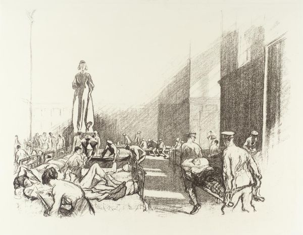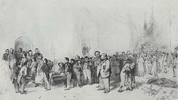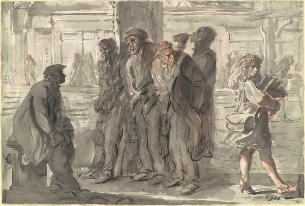 Curator: This is Reginald Marsh's "Derelicts Under the El," a 1946 ink drawing. What stands out to you immediately? Editor: A stark tableau of human dejection. The grey washes and angular figures evoke a real sense of hopelessness and anonymity. Curator: Marsh was deeply invested in depicting the realities of urban life, especially during the Depression era and post-war period. He often focused on marginalized figures, imbuing them with a sense of quiet dignity while also exposing systemic inequalities. Considering this work, how does he manage to evoke a particular mood through the symbolism of this place? Editor: The elevated train line casts a long, cold shadow, a symbol of industrial alienation. The architecture looms over the figures, reducing them. This perspective creates an imbalance where the people become emblems of poverty and despair, while the structures almost suggest society's indifference. It almost suggests that he thinks structures, too, play a part in our psychic architecture. Curator: The theme of social realism that defined much of the period after WWII intersects here. The drawing challenges the American dream mythos by presenting a counter-narrative: urban poverty, unemployment, the feeling of being invisible. In terms of contemporary dialogues, what layers does his piece add in a discussion around urban decay and economic inequality? Editor: Marsh creates a cultural symbol. These aren’t portraits, really. These figures, the slumped posture, the downcast gaze, echo and amplify themes related to socio-economic struggles, that we revisit over and over through the history of images and art. It has staying power as an iconographic reference. Curator: Marsh reminds us that cities are not just economic engines, but also sites of intense human drama and profound inequality. Editor: Yes, and reminds us, through the visual language he deployed, of the endurance of certain motifs for communicating social suffering.