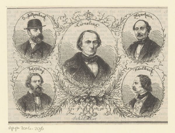 Editor: This is a print from before 1862, a portrait by Axel Jakob Salmson, titled "Portret van Professor Cottrely en zijn vier broers"—or, "Portrait of Professor Cottrely and his four brothers." I am struck by the rather formal presentation and subtle power dynamics at play, even in the posture of each of the subjects. How do you read this image? Curator: The portrait indeed carries a heavy symbolic weight. Notice the arrangement; Professor Cottrely is centrally placed, enthroned almost, which immediately establishes hierarchy. The brothers flank him like attendants or extensions of his being. This echoes traditional donor portraits, where family lineage and social standing are visually asserted. Editor: Donor portraits? Could you elaborate on that? Curator: They're portraits which embed the subjects within a broader societal and cultural narrative. Think of royal families or prominent religious figures surrounded by their kin. In this case, Cottrely’s intellectual and social authority is being reinforced, even through his brother’s subordination. The subtle differences in attire might also suggest their roles within the family structure or societal expectations, reinforcing those unspoken traditions and hierarchies. Editor: So, their clothes speak to societal roles as well? Curator: Precisely. Visual symbolism is multifaceted, reflecting historical memory and perceived social standing. Their fashion could communicate status, ambition, or adherence to specific cultural ideals. Group portraits were commissioned to solidify lineage and memory, so Salmson’s attention to each detail underscores the psychological and cultural stakes present when recording familial relations in art. What do you think the artist wanted to achieve? Editor: It's fascinating to consider how an image works not just as representation, but also as a cultural artifact actively constructing meaning. I initially saw the image as a straightforward portrait but thinking about the symbolic communication enriches the work so much. Curator: Exactly. Understanding those historical and psychological layers reveals the artwork as a carefully crafted statement within its specific cultural milieu.