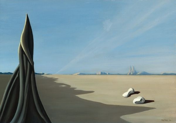 Luchita Hurtado made this painting with oil and maybe wax on canvas, and it's got this uncanny way of making you feel like you're both inside and outside at the same time. The way she’s built up the surface is really interesting: the colours, the textures, everything feels very physical, like you could touch it. It’s like she's trying to build this almost tactile space. Look at the row of rounded forms on the left, like toes or hills, each one casting a shadow. The sky is one colour, the land another, and there’s this kind of tension in the way they sit next to each other, pushing and pulling. There's a lunar orb in the sky, a perfect circle of white, that really draws you in. It’s like she's inviting us to consider the world from a different perspective, maybe a more internal one, by showing us that there is no single one. I think she's kindred spirit with Agnes Martin, or maybe Georgia O'Keefe.