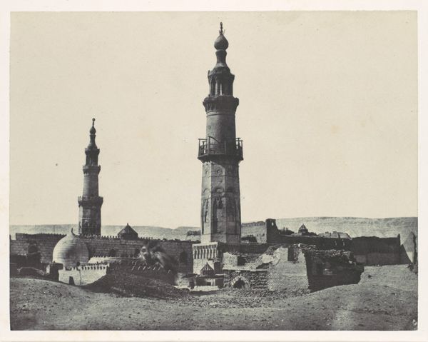 Curator: The Ochterlony Monument, Calcutta captured in the 1850s by Captain R. B. Hill, and now residing here at the Met. What a stark composition, isn't it? Editor: It has this uncanny stillness... like a held breath before a storm. Curator: Tell me more. Editor: Well, the monument dominates the landscape, yet feels strangely isolated. A relic towering above a vast expanse... reminds me a little too much of colonial dominance frozen in time. Curator: Precisely. This print—created through photography—presents an architectural scene and really offers us a view into British colonial India, particularly through monuments designed to reinforce power structures. It almost begs us to dissect its symbolism. Editor: Right, a photograph preserving this physical symbol, Ochterlony's monument, commemorates a British General, a celebration of victory, all etched into this space and frozen within the sepia tones of the photograph. It’s not just a pretty cityscape. It carries so much weight. Curator: And that’s the paradox, isn't it? What seems simple – a column rising above a plain – unravels when we unpack its layers. Editor: Absolutely. And beyond the overt symbolism, what do you think the image *wants* us to feel? Do we sense a longing? Is this emptiness an appeal, an admonishment? I wonder. Curator: Hmmm... perhaps that sense of stillness, of solitude, echoes a certain ambivalence about legacies—triumphs, certainly, but at what cost, and to whom? Maybe its legacy also encourages that introspection. Editor: A powerful piece indeed. It leaves one wrestling with the echoes of history and its visible imprints, right here. Curator: Indeed. The shadows of time play out on every monument— and photograph. A picture truly speaks a thousand loaded words, as they say.