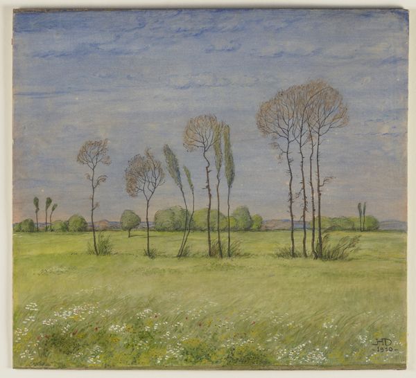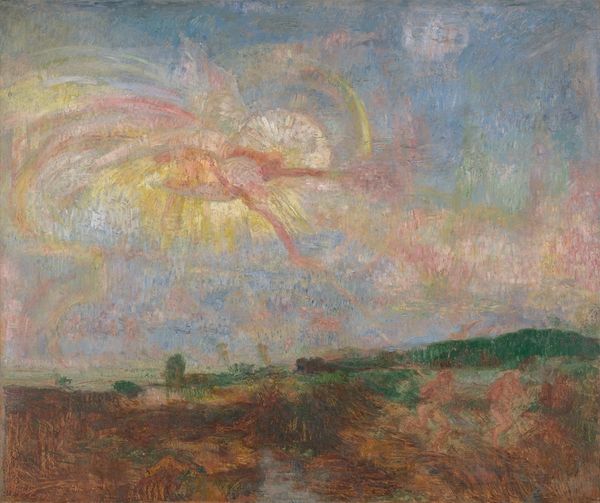 Editor: We're looking at "A Meadow at Sunset," a pastel drawing from around 1845 by Paul Huet. The colors are so soft and dreamy. It feels incredibly tranquil, almost like stepping into a memory. What draws your eye in this piece? Curator: Ah, yes, it has a lovely, hushed quality, doesn't it? For me, it's the sheer emotionality of the colors. Look at how Huet uses those pastels—that peachy-rose melting into the blue above the horizon. It's less about accurately depicting a sunset, and more about evoking a feeling of warmth and nostalgia. Makes you want to linger in that moment, doesn't it? Like chasing a fading dream. It almost feels musical; what chords do you think it would it play? Editor: That's a lovely way to put it! I was so focused on the subject matter – a very typical landscape scene – I almost missed how inventive the color palette actually is. The application of pastels is a really intriguing technique, too; are there particular qualities about pastels that would've appealed to the artist in this painting? Curator: Absolutely. The directness of pastel – pure pigment pressed onto paper – is incredibly appealing. There’s an immediacy, a visceral quality. It’s as if the artist is breathing color directly onto the page. You can feel that direct connection between artist and nature, wouldn't you agree? Do you feel any affinity for plein air works? Editor: Yes, you’ve helped me appreciate the fleeting, emotional quality it has; the ability to just quickly capture something you see in real life with a limited pallete – like you're taking notes! I can see how he created the color mixtures. Thank you! Curator: My pleasure! I hope you keep experiencing art, pastels and plein air works – just keep diving into the sensations, let your senses lead the way.