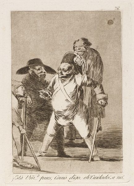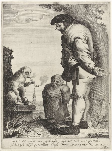 Curator: This is Isaac Weissenbruch’s "Standing Man with a Stick and a Dog," dating roughly from 1836 to 1912, housed here at the Rijksmuseum. It's rendered with pen on paper. Editor: It’s stark, isn’t it? All these etched lines give a raw quality, almost bleak, like a stage in a play. Curator: Indeed, the dramatic contrast certainly accentuates the linearity, showcasing Weissenbruch's mastery of line and form. Consider the confident hatching that models the figure’s garments— the economy of means, achieving depth and texture with such simple marks. Editor: Yes, but who is this figure? Look at his clothes, at the crude sandals on his feet. The bristling dog at his heel is a powerful symbol of loyalty. Is it simply about portraying the material circumstances of poverty and labor? Curator: The visual weight certainly falls upon the figure itself. It’s not simply an illustration, though; notice how the negative space interacts dynamically with the depicted subject. This tension and balance create an unsettling equilibrium. Editor: He gestures to something unseen, unheard. A need, perhaps. And consider Weissenbruch’s position at the edge of the Hague School – that group so pivotal in painting rural landscapes and the lives of peasants. Surely he’s responding to that ethos, making a statement, even a protest, using the symbolic vocabulary of the time. Curator: One could equally appreciate it for its masterful composition and elegant depiction of the figure and its subtle rendering, without requiring some external narrative crutch to arrive at value or worth. Editor: But to divorce it entirely from that is to sterilize it. This image speaks directly to ideas about societal division and the representation of marginalized individuals. Ignoring those dimensions, even in such a deceptively simple work risks erasing important context. Curator: Perhaps, but one must also recognize the sheer talent in crafting an image that holds such presence through skillful draughtsmanship alone. Editor: Point taken, still, I'm glad we can discuss both visual elements and deeper implications to find a richer understanding.