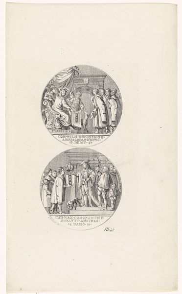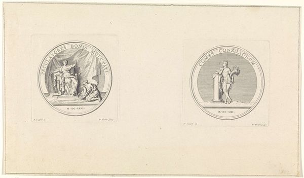 Curator: Look at this curious little engraving; "Twee penningen ter ere van Hugo de Groot," or "Two medals in honor of Hugo de Groot," dating from somewhere between 1710 and 1775, courtesy of Jan Caspar Philips. Editor: My first thought is… austere. Utilitarian, even. Like looking at old currency, but meant for something other than my pocket. They resemble ancient coins. Curator: That's a good observation. Think of it as historical currency, meant to solidify Hugo Grotius’s legacy. Each roundel showcases a profile portrait of the celebrated jurist and philosopher, a cultural heavyweight. They act as public commemorations, aligning Grotius with statecraft and intellectual achievement. Editor: "Cultural heavyweight"—love it. And I see now, this isn't about mere commemoration. It’s more about molding an image. Both portraits capture him in slightly different angles, creating almost a highlight reel of his best features, all while draped in Roman garb! Did they have PR back then or what? Curator: You’ve hit upon something important! Philips wasn’t just portraying Grotius; he was curating his image, anchoring it to classical ideals, notions of wisdom, and state authority. Consider, too, how printed images circulated, spreading those messages rapidly through society. These are more than just portraits; they are tools of canonization. Editor: I'm also drawn to the details – the inscriptions around the portraits are ornate. And what's with the depiction of that building or coffer between them? Is it significant to Grotius' life, or maybe symbolic? Curator: Aha! The imagery relates specifically to his famous escape from Loevestein Castle. You see the building has light emanating from it - Grotius was famously smuggled out in a book chest! This commemorates not just the man but his triumph over adversity. Editor: That's brilliant! It makes the medals so much more interesting, more tangible somehow. He transformed intellect and the written word into an action hero! Curator: Absolutely. These "penningen" offer a glimpse into how fame and intellectual heritage were carefully manufactured and circulated in the 18th century. They underscore how deeply embedded image and authority truly are. Editor: It really makes you wonder, what future stories will we engrave for ourselves and those we honor? How will later eras reinterpret our current figures and myths? Intriguing, truly!