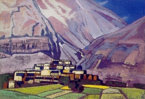 Curator: Looking at this painting called "Himalayas," by Nicholas Roerich, what immediately strikes you? Editor: The sheer geometric simplification. The peaks are reduced to these powerful, almost brutal, triangular forms. It gives the whole scene a kind of monumental stillness. Curator: Roerich, a painter deeply involved in the spiritual and cultural movements of his time, was profoundly influenced by Eastern philosophy. He believed in art as a vehicle for social transformation, for expressing universal truths beyond any singular cultural context. How might this influence be relevant? Editor: I see what you're saying, that he's deliberately avoiding realistic representation in favor of archetypal forms—these are not just mountains, but symbolic peaks of human aspiration. The restrained palette underscores this—browns, blues, purples...colors that evoke contemplation. The absence of figures seems equally intentional, reinforcing the sense of grand, impersonal forces. Curator: Exactly! Roerich's work emerged within the broader Orientalist movement, which, despite its issues, generated interest in and respect for Asian cultures and philosophies. His landscapes invite viewers to look beyond the purely aesthetic and to reflect on human potential and spirituality in the face of what he calls the 'challenge of the heights', the journey of the soul and our common cultural foundations, all within these spaces. What is more striking than such spirituality within a harsh nature as we see it in the painting. Editor: I appreciate that perspective, but can we not overlook his compositional technique here? The arrangement is deliberate and static; each mountain functions like a mass which brings in harmony but also separation through these clear lines that delineate each rock formation with a specific color tone to add depth to the picture. Curator: That is true, it highlights the dichotomy between personal quest and universal identity, how it shapes the view, depending on where one stands or decides to embark on the climb. It's complexly rendered in a simple visual expression. Editor: An impressive blend of form and philosophical underpinning. The painting prompts you to contemplate about the material nature of it and its semiotics that shape not only the scene but our interpretation.