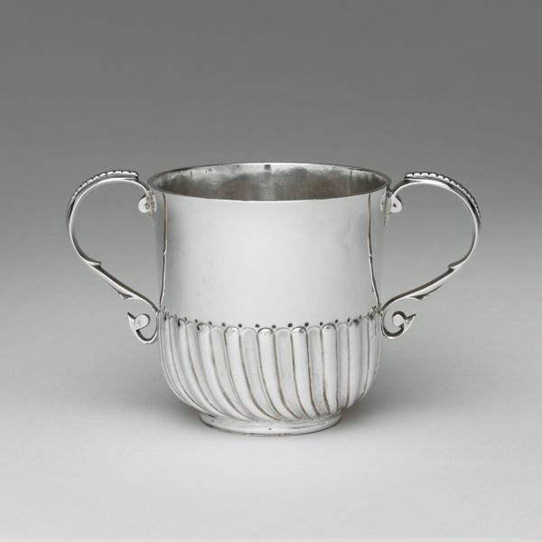 Curator: This diminutive silver vessel, created by I. H. around 1694-1695, is currently held in the collection of the Metropolitan Museum of Art. Known as a "Miniature porringer," it represents a compelling moment in the history of decorative arts. Editor: My initial impression is one of simple elegance. It feels both delicate and precious. Given its small size and gleaming surface, I wonder about the rituals and power dynamics embedded within it. Curator: The porringer form, a low, shallow bowl with handles, was a common vessel type of the late 17th century. Its scaled-down dimensions transform its purpose from functional to symbolic. Consider the engraving. "AW." Whose initials are these? Perhaps belonging to an elite child of the era. It gives it an incredibly intimate aura, doesn't it? Editor: Indeed. Who was A.W.? Why a miniature? It makes me think of the performative aspects of childhood in elite society. The size of this porringer, fashioned of such precious material, might be seen to embody childhood innocence, delicacy, a reminder of generational continuity... but also of the inherent privilege that some children possess. It’s fascinating to imagine the web of social meanings such an object held. Curator: Silver itself is a significant choice, representing wealth, status, and taste. But also the reflective properties: does it offer us insight, as the user gazes at themselves mirrored within, what images or emotions would be projected through their point of view. Editor: I find myself dwelling on the act of giving this as a gift. Perhaps a baptism or naming ceremony. The performativity aspect within gift giving is interesting to observe here. Curator: Yes, its cultural significance extends beyond its materiality and Baroque styling. Silver was also seen as a protective element, warded off ill fortune and diseases. So, perhaps it's a totem intended to safeguard its bearer, carrying a burden of hope. Editor: This highlights how seemingly straightforward objects often become powerful mirrors reflecting cultural anxieties and social structures. So much meaning can be projected from something this small! Curator: Yes, quite, this vessel, although diminutive, is monumental for offering insight into history, craft, and humanity itself. Editor: A compelling little object—it prompts us to ask big questions.