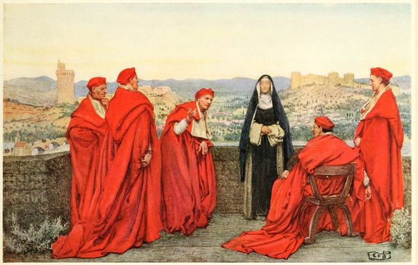 Edmund Blair Leighton painted "The Charity of Saint Elizabeth of Hungary," using a traditional oil on canvas technique. The composition is immediately striking, dividing the scene into distinct zones of light and shadow which serve to highlight the central act of charity. Elizabeth's red dress and pale complexion stand in stark contrast to the darker tones of the surrounding figures and architecture. Leighton's masterful use of color creates a visual hierarchy, drawing the viewer's eye to Elizabeth as she offers bread to the poor. The structure of the painting suggests a conscious engagement with the Victorian ideals of social responsibility. The act of giving is framed by the solid stone architecture, emphasizing the charitable act within a broader social structure. Consider how the artist uses diagonal lines to lead the eye from the saint to the recipients, creating a dynamic yet balanced composition that invites contemplation on themes of wealth, poverty, and the moral obligations of the privileged. This is not merely a historical depiction, but an exploration of ethical codes.