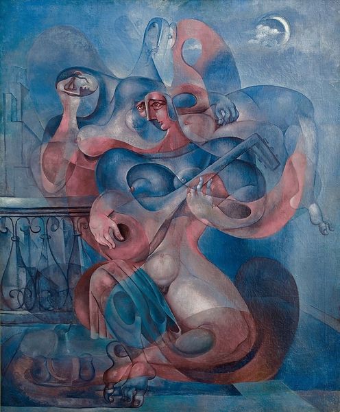 Editor: So, this is Jean Metzinger's "La Femme au Cheval," painted in 1912. It’s an oil painting. Looking at it, I immediately feel a sense of fractured intimacy, like a memory viewed through a shattered lens. What jumps out at you when you look at this piece? Curator: Ah, yes, "shattered lens" is spot-on. I see Metzinger playing with the very idea of perspective here, a hallmark of Cubism. He’s inviting us to consider not just what we see, but how we see. I feel it in my bones. Don't you get the sense he's dissolving boundaries? Woman, animal, cityscape—all flowing into one another? Is it erotic to you? Editor: Absolutely. The way the woman and the horse kind of blend together. Is he exploring the connection between humans and nature, or is there something else at play here? Curator: Perhaps both! Remember, this was a time of rapid change, technological advancements blurring the lines of the human experience. Metzinger, in his brilliant way, might be mirroring that fragmentation within ourselves, that questioning of identity. There's the echo of the Garden of Eden in that cornucopia. Don’t you get it? What do you see? What do *you* feel? Editor: That’s such an interesting way to put it – that fragmentation mirroring a larger cultural shift. It helps make sense of the initial dissonance I felt. Now, those little touches of color in the flower draw my eye! Curator: Precisely! And they offer just enough to give a foothold in all that abstract expression. Like a lifeline to feeling grounded in something. Metzinger is like a wise friend, inviting us to dance with discomfort and revelation. Editor: I love that. I definitely see it in a completely new light now. Curator: Good, it will serve you to get away from "light," young Jedi. And more on feeling now, ok? It's the beginning of wisdom in life and in art.