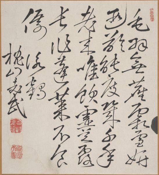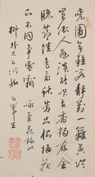 This is a piece of calligraphy by Gion Nankai, made in Japan probably in the first half of the 18th century using ink on paper. Nankai was a Confucian scholar and government advisor who turned to art and poetry after being exiled from his position for protesting government corruption. The text is written in a cursive script and is most likely a poem, which would have been read from top to bottom, right to left. Calligraphy was an important social practice in Japan at this time as it was seen as a reflection of the writer's character and learning. This piece would likely have been created for a specific social setting, perhaps exchanged between friends or displayed in a private home. By studying the life and times of Gion Nankai, and researching the social context in which calligraphy was produced and consumed, we can better understand the meaning and significance of this work.