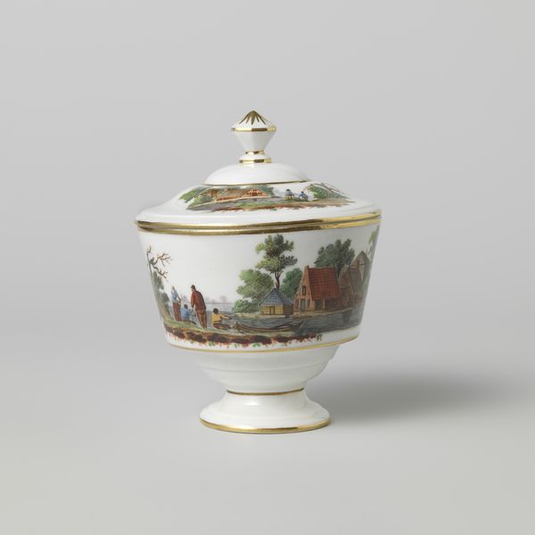 Editor: This is a porcelain sugar bowl made by the Koninklijke Porseleinfabriek Dommer & Co. between 1809 and 1814. The painted scenes feel like peering into a miniature, idealized countryside. What draws your eye to this piece? Curator: Oh, it whispers of simpler times, doesn’t it? For me, it's not just the picturesque landscape—the grazing cows, the figures idly chatting – it's the audacity of shrinking a whole world onto something so domestic. Makes you wonder about the owner. Did they gaze at it, yearning for rural escape as they stirred their tea? The artist has, ever so cleverly, positioned the animals to encourage the viewer to keep moving. A sort of invitation. Don't you think? Editor: Absolutely, the continuous landscape invites you to turn the bowl! Do you think the choice of subject also connects to a specific artistic trend of that era? Curator: Undoubtedly, the Neoclassical taste for idealized nature is very strong here. Think of it as a longing for a pre-industrial Arcadia, filtered through a Dutch lens. There’s a gentle irony, of course – the elite classes, indulging in such pastoral scenes whilst profiting from increasing urbanization. Tell me, what does it spark in you? A longing? A curiosity? A raised eyebrow perhaps? Editor: A bit of all three, actually! I never considered the subtle commentary of the rural scene in contrast to urban life, as you described. It gives a whole new perspective on what I initially thought was simply decorative. Curator: Exactly! Isn't it wonderful how a simple sugar bowl can contain so much history and cultural commentary? Makes you want to start a collection, doesn't it? Editor: Absolutely, I'll be on the lookout for more of these historical narratives!