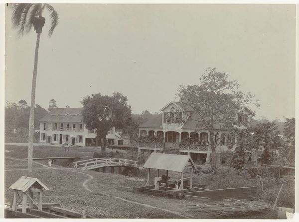 Curator: So peaceful. I could happily lose myself in that image for hours. It evokes a deep sense of nostalgia, doesn't it? Editor: It does have that quality. This is a photograph from 1897 titled, "Gezicht op twee villa's, vermoedelijk in Le Moulleau bij Arcachon." It depicts a couple of villas nestled in what seems like a tranquil countryside setting. It resides here in the Rijksmuseum’s collection. Curator: Yes! It's like a memory of a summer afternoon. The hazy sepia tones give everything a dreamlike quality. Almost like stepping into a memory, not unlike my grandparents’ house, somehow... Editor: What strikes me is the subtle interplay between nature and architecture. We see the villas, signs of human design and aspiration, almost swallowed by the surrounding forest. It prompts questions about humankind's relationship with the environment. Are we imposing, or integrated? Curator: Integrated, I hope! I see these houses as charming little beacons in a wilderness that both embraces and dwarfs them. Imagine sitting on one of those porches with a book! Also, note how the fence almost seems unnecessary—a gentle border, not a stark division. Editor: That fence speaks volumes, actually. Who is being kept in or out? Those barriers were so often implicated in exclusions based on race and class. Even in this apparently idyllic setting, it's critical to remember such divisions. It prompts thoughts on accessibility and privilege that might be invisible in such scenes. Curator: Hmmm, I hear you. But I must admit that looking at it, that’s the last thing I think about! Instead, it gives me the chance to fantasize about a quiet rebellion – trading the modern world's hustle for the calm simplicity of these villas, back when slowing down wasn't just a trendy fad, but just how things were. Editor: Perhaps there’s value in exploring how aesthetic pleasure can coexist with historical awareness. We can appreciate the image’s beauty while staying vigilant about its historical context and potential silences. This image can evoke discussions of leisure and luxury from the late 19th century and also invites considerations of who benefits from these visual paradises. Curator: Ultimately, isn't art about connection? To beauty, to history, to our own memories, hopes, and, yes, even discontents? Even a picture as simple as this one provides all those doorways to explore and, maybe, to change how we look at things. Editor: Yes, it truly highlights how images, seemingly simple, hold multiple layers. It is this kind of ongoing engagement that can make viewing these pieces so illuminating and enriching.