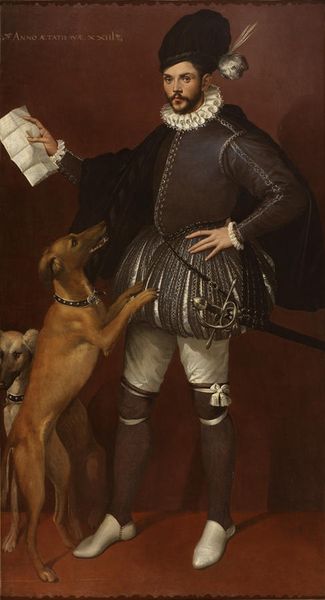 Editor: Here we have Paolo Veronese's "Boy with a Greyhound," painted around the 1570s in oil. The somber hues lend it a dignified air, and the boy's gaze is quite arresting. How do you interpret this work, given its historical context and your own sensibilities? Curator: Arresting indeed. It whispers stories of Venetian opulence, doesn’t it? Veronese captures that glimmering fabric, those slightly ridiculous pantaloons... it's all so wonderfully, terribly aristocratic. And then you see the boy's eyes – is it boredom? A flicker of disdain? It's hard to say. He's tethered to privilege as surely as the greyhound is to him. What do *you* think the dog symbolizes here? Editor: Perhaps loyalty, a companion… something pure compared to the elaborate, restrictive clothes he wears? Curator: Perhaps. Or is it another possession, carefully bred for speed and beauty, like the boy himself? Notice how the muted colors seem to drain away the youthful playfulness we might expect. It almost feels as though Veronese is slyly poking fun at the whole spectacle. The sword hanging on the belt just completes this sense of staged dignity. Editor: I hadn't considered it that way. The greyhound, the sword, the fancy clothes... they are extensions of the boy's status. Curator: Precisely. It makes one question what it really means to ‘capture’ someone's essence in a portrait, doesn't it? Was the painting meant for celebrating status or something else entirely? Editor: Absolutely. This has completely shifted my perception; I now see more of the social commentary and less of the straightforward portrait. Curator: It’s always about peeling back the layers and searching beneath the surfaces. This is a starting point and something we both can consider!