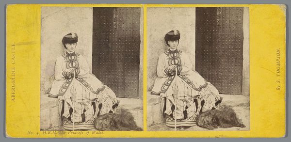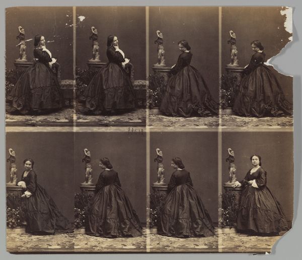 Editor: Here we have André-Adolphe-Eugène Disdéri’s, "V Queniaus," from 1860. It's an albumen print. The multiple exposures and stiff posing make me think about the constraints of early photographic processes. What stands out to you? Curator: I'm immediately drawn to the material production. Look at the visible seams of the multiple exposures – Disdéri is laying bare the process. It wasn't about creating seamless illusion, but showcasing a technological marvel. The albumen print itself – think about the labour involved in preparing the egg whites, coating the paper, exposing, developing… it’s a very hands-on material engagement. Editor: That’s a good point. It really highlights how different this is from today's point and shoot mentality. It was such a deliberate process. Curator: Exactly! Consider also the social context. Portraiture was previously reserved for the elite through painted commissions. Now, photography offered access to a wider middle class. Disdéri cleverly capitalized on this, offering multiple poses on a single card. It became a commodity, didn't it? A photographic visiting card. Editor: A very early form of the selfie, in a way, consumed and distributed in social circles. Curator: Precisely. And observe her dress, the visible artifice of the pedestal and potted flowers – they’re props. What are they trying to communicate? Are these things mere signifiers of status, readily available for purchase along with the photograph? Editor: That's fascinating. I never thought about the objects in the image as part of the consumable package. I’m rethinking the whole photograph now! Curator: It’s about seeing beyond the surface representation and digging into the means of its creation and the culture it served. Hopefully we both gleaned a deeper insight into 19th-century photography, moving beyond merely admiring the image, and understanding the how and the why behind its making.
