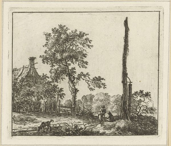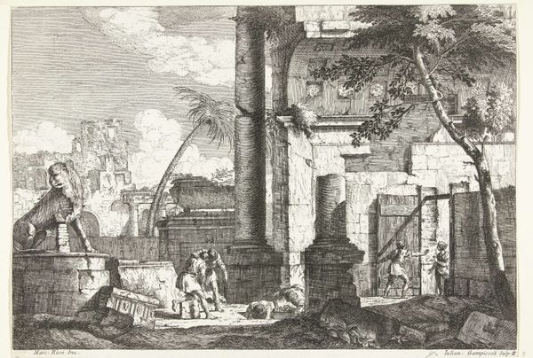 Laurens Barata created this etching, "Man leaning on a stick in front of a ruin," using black ink. Without a known date, contextual clues situate it within a broader historical fascination with ruins, especially as symbols of lost empires and vanished times. The ruin isn't merely a backdrop; it's a character in the scene, embodying histories of power, decay, and perhaps even resilience. The man leaning on a stick can be seen as a figure contemplating the passage of time and reflecting on the legacies of the past. His stance suggests a moment of pause. The etching also subtly addresses themes of social class. Ruins often became tourist destinations for the wealthy, while local populations might experience them as daily reminders of economic or social disruption. The artist invites us to consider what is remembered, what is forgotten, and who has the privilege to interpret and narrate history.