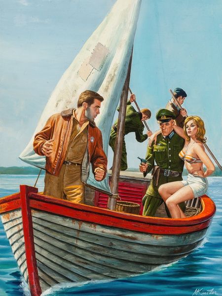 Curator: Victor Prezio's "Captive," an oil on canvas painted in 1959, is quite a striking composition. The title immediately primes us to consider themes of power and subjugation. What’s your first impression? Editor: Stark! My first impression is one of dissonance; the near hyperreal figures stand in contrast with their unreal predicament. How should we reconcile the soft focus given to this woman, rendered nude amid conflict? Curator: That contrast is key, especially considering the probable intended audience—likely men consuming this through pulp magazines, revealing anxieties and desires projected onto a war-torn world. The hyper-feminine image, juxtaposed with the masculine realm of military conflict, plays into longstanding gendered tropes. Editor: Yes, and looking at the materiality, I'm wondering about Prezio's intentions. Oil paint can have incredible richness but is used here to, in effect, give us a glossy, commercial image of women. The material is used almost to mask, rather than to reveal complexities of the situation. It speaks volumes. Curator: The work undeniably perpetuates problematic portrayals. She's presented as both a victim and an object of desire, lacking agency within the scene, the narrative implying a certain exoticization reflective of its time. Consider the societal and cultural anxieties of the Cold War era; themes of paranoia, fear of invasion, are manifested in the narrative and portrayal of this captive woman. Editor: Exactly! And what of the material circumstances surrounding this piece's creation? How did his access to materials and artistic training enable such a striking, yet ethically problematic, construction of gender and conflict? The production of these images has very real repercussions on cultural perceptions and understanding. Curator: Right. Even now, it provides a space for critical dialogue around representation, power, and the often-troubled relationship between art and social commentary. Editor: A compelling yet deeply unsettling creation—and the materials only help highlight its contradictions. It certainly demands close, careful study.