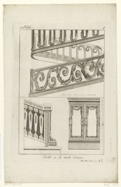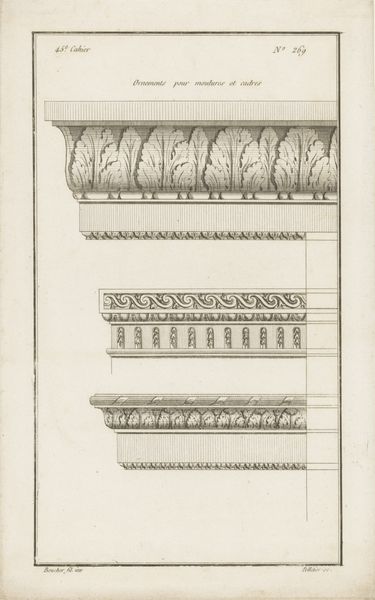 Curator: Looking at this meticulously rendered image, I am struck by its clarity. The work is called "Kroonlijst met fruit," or "Cornice with Fruit," made around 1784-1785, created by Augustin Foin. The piece, an engraving, showcases a potential decorative element, almost architectural, made with precise lines on paper. Editor: It gives off a cool and collected vibe. At first glance, I am drawn to the almost edible quality of the rendering. The artist clearly enjoyed detailing the abundance of these fruits, maybe even relishing in the visual effect more than a deeper meaning. Curator: What catches my eye is that this piece represents Neoclassical art and decorative style, prevalent during the late 18th century. There's a turn away from the extravagance of the Baroque period, which is being traded here for something controlled, reserved, almost mathematical in its precision. Editor: You see a formal artistic intention, and I cannot help but look into those clusters of grapes and swollen pomegranates that symbolize bounty and divine favor! Since the fruit is arranged around the other ornaments in the overall architecture, could this tell us how precious nourishment was considered within a home or place of commerce? Curator: Certainly. This "fruit cornice" as the name translates, would be found inside of someone's place of dwelling or commerce. Because architectural drawings like this were printed and distributed widely, you can picture people looking through similar images and designs while choosing features for new buildings that symbolized order, balance, and idealized beauty. Editor: But that focus on geometric perfection! While there's definitely a naturalistic appeal here with these forms of ripe fruit, its tight order makes me question how connected people were to these harvest symbols as more people moved into cities, and further from their sources. The piece captures a moment of transition from organic to manufactured imagery, almost a premonition for later industrial arts. Curator: That tension between nature and design is fascinating! The work’s cool detachment provides the intellectual framework through which we interpret Foin’s work, understanding that, yes, something has been lost as much as has been found. Editor: I agree. And in understanding this cultural shift we realize these decorative arts also reflect complex values far beyond pure artistry.