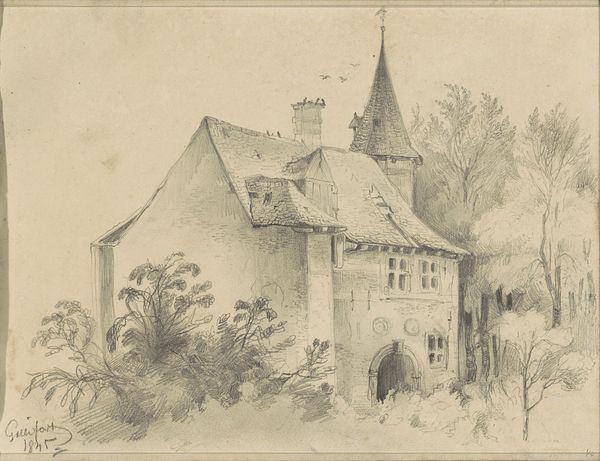 Curator: Look closely at Johann Friedrich Hoff's "St. Ursula in Oberursel," created in 1857. It's a pencil drawing, currently residing here at the Städel Museum. What strikes you first? Editor: That almost ghostly lightness. It feels like a half-remembered dream of a village, a tranquil place that time almost forgot. Curator: It definitely has that Romantic era nostalgia baked in. Hoff is idealizing a small-town life framed by a dominant church spire. Note the architecture, which he captures in detail. Editor: The figures bring it to life, though. They look like they're clustered around a well or fountain. Daily life unfolding in the shadow of something immense, both protective and…imposing? Curator: That tension between the everyday and the monumental is central to the imagery of the time, I think. Churches and cathedrals were often featured as a key focal point in architectural landscape pieces. Think about the role of religion in shaping societal values back then. Hoff gives us more than just a landscape, it is the foundation of village identity. Editor: Right, the way civic life centered around these imposing structures. I am interested to note the romanticist trend of framing the city and village people as inherently good in comparison to city life at that time, something akin to, dare I say, Rousseau's philosophies. Curator: Exactly. The sketchiness, the light touch—it avoids anything that jars. We're invited to linger and appreciate. It lacks some grit because it isn’t really about accurately depicting labor or commerce as some paintings may. Rather, it evokes a sentiment, a specific feeling linked to this particular locale. Editor: Almost like an imagined memory. The Romantic artist inviting us into their ideal past. But seeing it today, with our modern perspective, we add a layer of meaning to it—a certain poignancy for simpler times, maybe? Curator: Indeed. Hoff gives us a glimpse into a 19th-century view of the town, filtered through an artistic lens. It prompts reflection about how such places functioned, how people then related to structures of belief, of how sociality came to take shape. Editor: And how, maybe, we project our own longing onto these quiet, meticulously rendered scenes. A whispered question about a world we have never lived in.