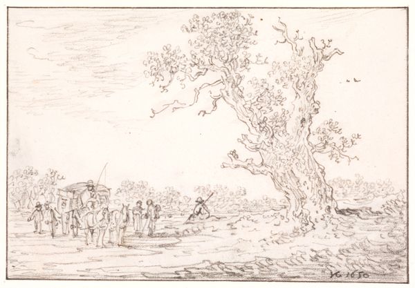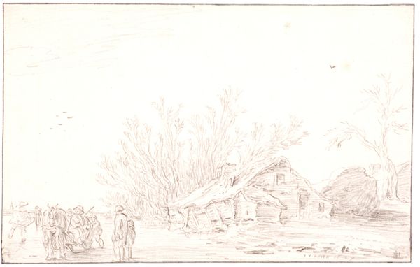 Curator: We're looking at "Landscape with a Road Along a River", a 1627 drawing by Jan van Goyen currently held at the SMK, the National Gallery of Denmark. The medium appears to be etching, or perhaps pencil and ink? Editor: It’s incredibly pale. Almost ethereal, isn’t it? Barely there… the quiet scene almost feels like a dream, and those figures so small and frail. It's delicate, on the verge of fading away like memory. Curator: Yes, the subdued tones are striking. The landscape genre became a booming industry in the Dutch Golden Age. What I see is that Van Goyen skillfully exploited the readily available, and affordable, materials such as paper, etching tools, and common pencils, rendering mass-produced works for a bourgeoning middle class hungry for depictions of familiar, local scenery. Editor: That commodification is significant, absolutely, especially when we consider land ownership during this period. Who had access to land, who was displaced, whose labor actually built these idyllic settings? How does the burgeoning merchant class affect traditional rural communities, and their sense of place? That placid river likely serves commercial ends; not just aesthetic beauty. Curator: And those two tiny figures walking away from us? Probably lower class rural folks—they're barely rendered at all. Van Goyen's etching skill captures atmospheric depth with minimal strokes—he could make these relatively quickly. Editor: The absence of detail says something. The laboring class almost dissolves into the landscape…rendered anonymous against the looming Dutch landscape. The church spire hints at larger religious powers also shaping their lives. This "realistic" scene masks power dynamics. Curator: And yet, that mass-produced nature afforded the common buyer a personal, emotional connection with their locale. It fostered identity, however complexly formed. Editor: Perhaps. Art, however, must always be understood through the intricate webs of class, economy and history. This idyllic vision often veils the struggles underpinning it. The material conditions reflect cultural values, yes? But often values of only the dominant class. Curator: Absolutely. The material is never neutral, it reveals social values—what’s deemed worthy to be produced, and by whom. Editor: Exactly, and with Van Goyen, these delicate, almost whispered landscapes can tell more potent stories of power, class, and labour than one initially anticipates.