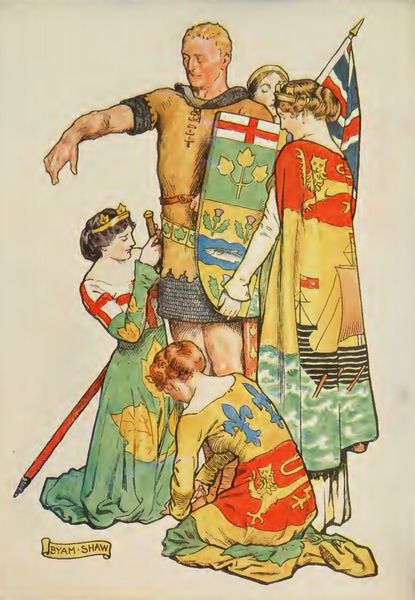 Editor: So, here we have George Barbier’s "Entre deux feux" from 1922, rendered in watercolor. It depicts three figures in highly stylized traditional costumes. It strikes me as being so theatrical; almost like a stage design. What draws your attention when you look at it? Curator: As a materialist, I’m most intrigued by how Barbier uses watercolor to both depict and, in a sense, perform class distinctions. The costumes, with their lavish embroidery, aren't just illustrations; they are material signifiers of a specific socio-economic sphere. Note how Barbier employs precise, controlled strokes to meticulously recreate these elaborate designs. Editor: Right, the level of detail in the embroidery is incredible. You can almost feel the texture of the fabric. It makes me think of the labor involved in producing clothing like that. Curator: Exactly! The meticulous rendering calls attention to the human effort of their crafting. And that begs the question: Who is making these garments? What is their social position? By showcasing this high level of craftsmanship within an "Art Deco" aesthetic, is Barbier commenting on the tensions between industrialized production and artisanal skill? Editor: So, he's not just representing a scene, he's highlighting the economic relationships embedded in these garments, or more broadly the system of fashion itself. Do you think he's celebrating this craftsmanship or critiquing it? Curator: It’s ambiguous, isn't it? The stylized forms seem to admire the aesthetic qualities, while the emphasis on the crafted nature pushes us to think about the lived experience of the artisan, about class structure, and consumption. Editor: I never thought about watercolor being capable of carrying so much meaning related to the means of production and consumption! It’s a fascinating reinterpretation of what this image means. Curator: Indeed. Examining the material culture embedded in the artwork allows us to reveal the labor that is materialized, quite literally, in fashion of the time.