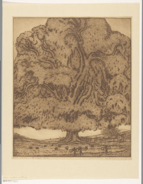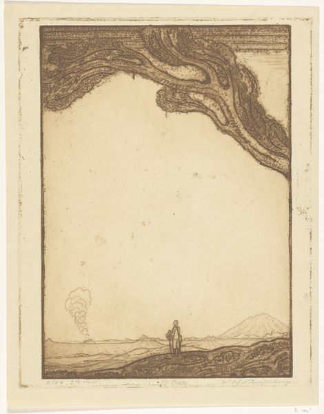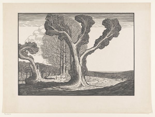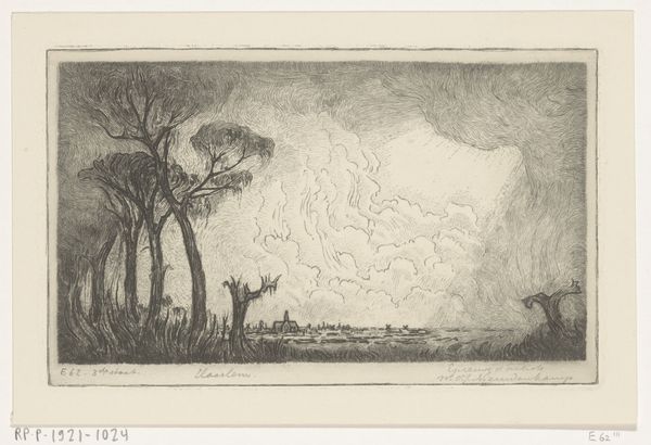 Curator: This drawing by Henk Schilling, dating from 1903 to 1920, is titled "Landscape with Bare Trees and Cloudy Sky." What's your immediate impression? Editor: A brooding, elemental energy. It looks like a landscape on the verge of transformation, maybe even destruction. The use of pencil is striking. Curator: Absolutely. Schilling seems deeply invested in a romantic tradition that explored the emotional resonance of the natural world. I see reflections of societal anxiety, particularly regarding human impact on the landscape itself. Editor: You're right. The medium reflects this theme, right? Pencil lends itself well to capturing the textural details of the natural world, especially these tempestuous clouds and gnarled trees. The artist had to choose pencil and paper as material--he even highlights the work's process through expressive mark making. Curator: Precisely. I think he’s exploring a deep ambivalence, suggesting how industrial labor transformed landscape and humanity alike. There’s the sublime awe of nature combined with a palpable sense of vulnerability, a common Romantic preoccupation. Editor: Looking closer, there's a raw, almost unfinished quality, to the execution. This rawness contributes to its impact. It also serves to bring us back to the material, to the hand of the maker, that this was an intentional, labor-intensive practice, no accident. Curator: That hand is expressing what I see as a dialogue between art and political consciousness, a yearning for an uncorrupted natural world juxtaposed with its increasing impossibility. It echoes philosophical themes present in ecofeminism and deep ecology, really underscoring those questions around our relationship to the Earth. Editor: I see the impact that even this seemingly simple landscape communicates—that there is beauty, terror, and inherent change, conveyed through such humble tools. It's a potent statement, isn't it? Curator: It really is. By studying the artwork through this socio-historical lens, we see the drawing becomes more than just an appealing image. Editor: Exactly. By thinking about the materials and method we open a view onto that complexity.