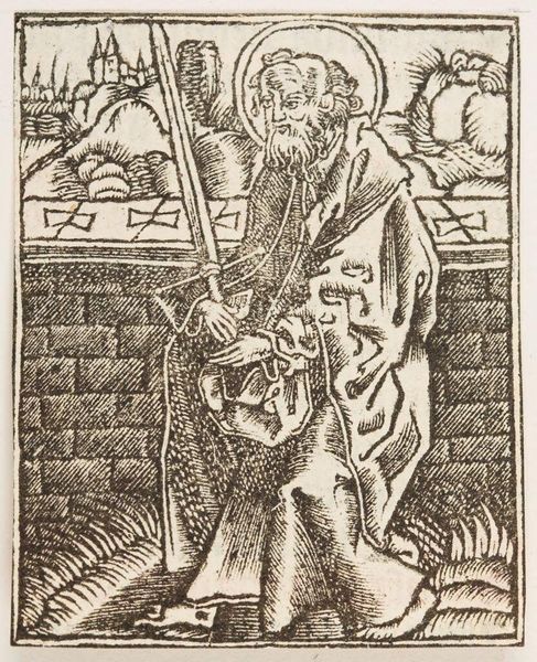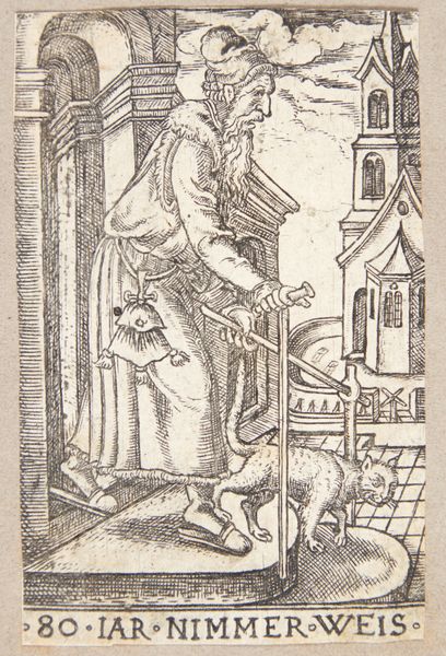 Curator: This is Sebald Beham's "St Jerome at the Arch," a small engraving from 1520. It's part of the collection at the Harvard Art Museums. Editor: The stark contrasts give it a very serious mood. The saint seems burdened, even trapped, by the archway looming over him. Curator: Observe how Beham uses the arch—not just as a frame, but as an architectural feature that defines the space around Jerome. The lines create depth and direct the viewer's eye. Editor: And that placement! Presenting the saint in the foreground like this is interesting, when the background reveals that this image is about the changing urban landscape in the Reformation era. Curator: Indeed. It's a visual language where symbols meet the emerging aesthetics of its period. Editor: So, there’s a historical narrative embedded in its graphic elements. I find it fascinating how it all intertwines. Curator: Absolutely, it’s a testament to the artist's capacity to convey depth through form and context. Editor: It certainly offers more than meets the eye; a window into history, expertly crafted.