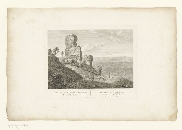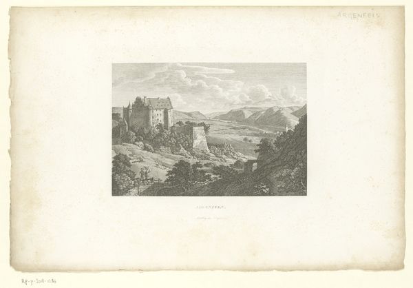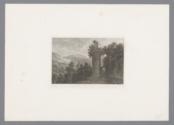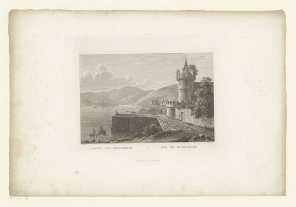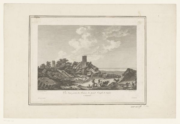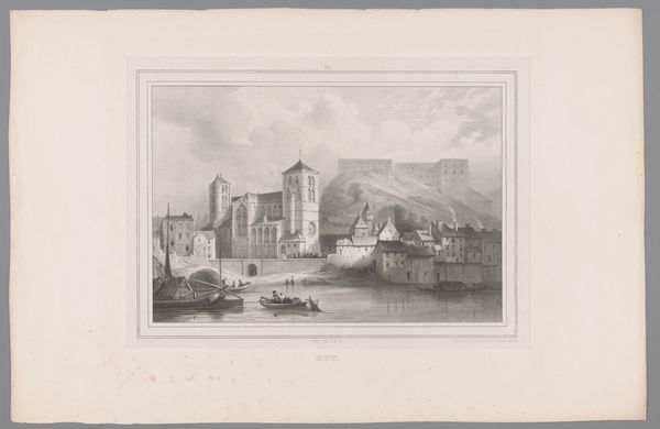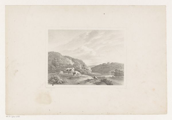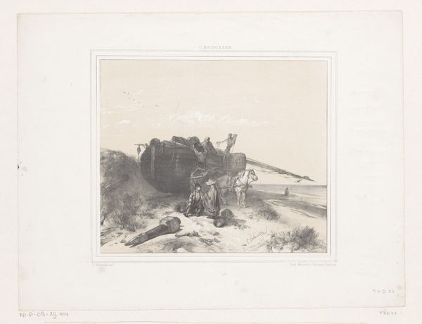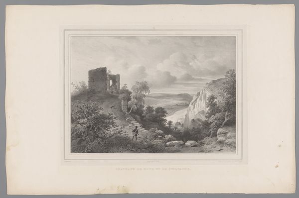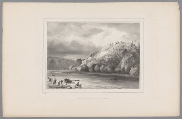 Louis-Julien Jacottet created this artwork, "Zicht op de Møns Klint" using lithography. The composition is structured around the stark contrast between the imposing chalk cliffs and the serene, reflective sea. Notice how Jacottet uses the play of light and shadow to emphasize the geological grandeur and the subtle gradations of tone to create depth. The lithographic technique allows for fine linear detail, evident in the rendering of the foliage and rock textures, which serve to ground the viewer. The visual elements are carefully arranged, and the figures placed to enhance our sense of scale and perspective. The work evokes a feeling of sublime awe and the power of nature. Through structural binaries, the artwork balances precision and romantic sensitivity, reflecting a broader cultural fascination with landscape, and reminding us that art invites continuous dialogue and interpretation.