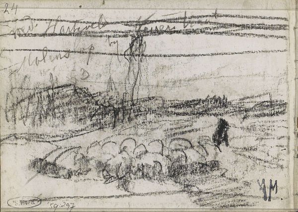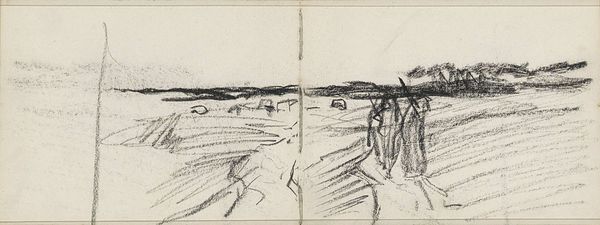 Curator: This expressive ink drawing is titled "Calves in a Meadow" by Rik Wouters. Notice the economy of line; he evokes the whole scene with such quick, sure strokes. Editor: My first impression is one of pastoral serenity, yet there's an underlying tension. The stark black ink against the white creates a somewhat unsettling contrast. Curator: That tension is interesting. Ink drawings, particularly those done with this kind of energetic hand, can reflect a search for balance. Wouters gives us just enough information to read the image, but avoids any hint of photographic realism. It suggests an emotional reality over a literal one. Think of the cow as an enduring symbol across diverse cultures. What might they mean here? Editor: Yes, that deliberate mark-making suggests something deeper. Consider the historical context; while idyllic on the surface, representations of rural life can often gloss over the labor and economic disparities inherent in those landscapes. Is there commentary, perhaps a quiet critique of romantic notions of countryside living, embedded here? Or are these calves emblematic of innocence itself, grazing placidly behind the constraints of human industry? Curator: It's certainly open to interpretation. The use of stark ink carries symbolic weight in many traditions too, speaking of beginnings or even loss, not only the visual shorthand to give this picture form. Wouters may be using the genre conventions to suggest something universal about our relationship to the land and its creatures, beyond easy associations of the genre-painting’s ideal of pleasant country-life. Editor: Right, the black and white reinforces the fundamental dichotomies inherent to rural life – human versus nature, domesticated versus wild, worker versus consumer. By stripping the color away, we are confronted with those power dynamics directly. Curator: Precisely! So, what initially seems like a simple countryside scene, quickly evolves into an intricate meditation. I will look differently on it now! Editor: And I'm more aware of the undercurrents that simmer beneath the deceptively calm facade. A worthwhile exercise in visual decoding.