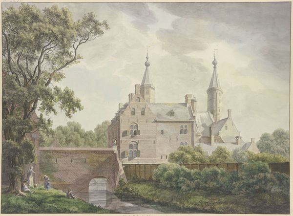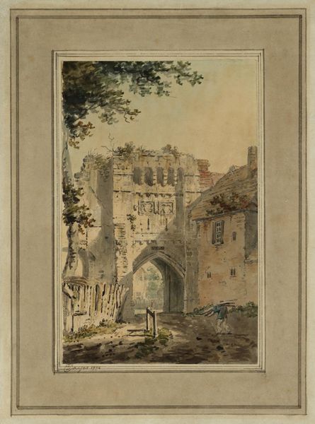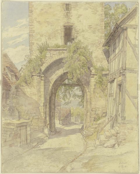 Friedrich Maximilian Hessemer created this watercolor, Stadttor mit Aussicht auf eine Kirche, at an unknown date. The immediate impression is one of framed perspective, a view into a world structured by stone and light. Hessemer uses the archway not merely as a structural element but as a profound semiotic device. The arch, rendered with meticulous detail, acts as a signifier of transition. Its solid form invites us to consider the passage from one state to another, from enclosure to openness. The church in the distance, framed by this arch, becomes more than a building; it symbolizes aspiration, and Hessemer uses it as a focal point to question established values. The subdued palette, dominated by earthy tones, complements the geometrical rigor of the composition. This creates a discourse between the material and the spiritual, a dialogue that challenges fixed meanings and engages with new ways of thinking about space and representation. Hessemer's use of perspective and light destabilizes established meanings, compelling a re-evaluation of the world and the structures that define it.