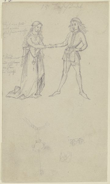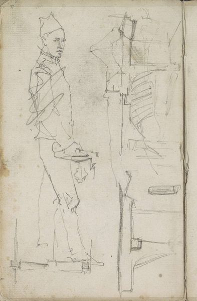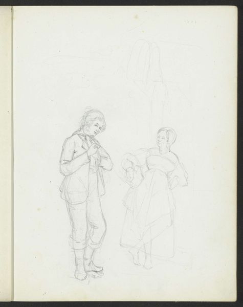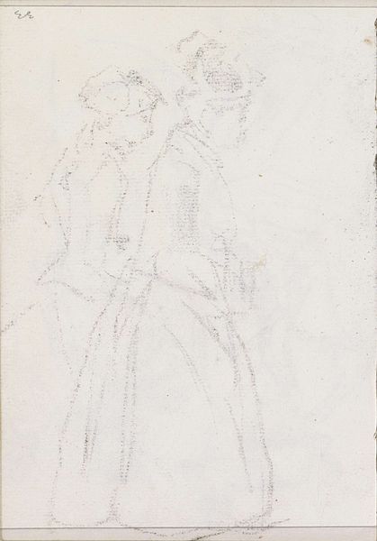 Curator: Here we have "Sketch of Two Men," a pencil drawing by Charles Rochussen, dating from between 1824 and 1894. It currently resides in the collection of the Rijksmuseum. What are your initial thoughts? Editor: Immediately, I sense a certain melancholic quality, despite the simplicity of the sketch. The tentative lines, the slightly faded appearance—they speak of transience and perhaps even a societal anxiety inherent in portraying men with that specific silhouette from that specific timeframe. Curator: It’s interesting you pick up on that sense of transience. Looking at the technique, we see Rochussen employing a rapid, almost shorthand method of notation. He’s less concerned with precise detail than with capturing the essence of form and bearing, their "habitus" if you will. Note, too, the clear linearity and structuralist implications. Editor: True, but to disregard its historical weight, only to analyze form, strips these subjects bare. This feels distinctly like a study of men, in the time of increased capitalist means and societal anxieties: a marker of shifting gender roles where appearance mattered enormously and signaled class. What statements were being projected? It isn't necessarily innocent, wouldn’t you agree? Curator: Indeed, but Rochussen leaves much open to interpretation. Consider how the very lack of precise details allows them to embody more than one archetype of bourgeois masculinity. The work becomes representative, yet resists easy categorization. Editor: And isn’t that resistance itself telling? These men, defined by their attire, by the aspirations—the sketch refuses to render them completely legible, as if suggesting that beneath the top hats and coats lie contradictions, inner turmoil and hidden histories within 19th-century patriarchy. Curator: A compelling argument. It's clear that Rochussen's seemingly simple sketch holds within it a complex interplay of form and context, making it more than a mere study of male figures but a window into societal constructs. Editor: Precisely. Hopefully, this will encourage more conversation surrounding those bygone-era themes.