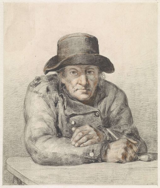 Editor: So here we have "Man with Hat and Cigar," an etching by Frans Schwartz, created in 1881. The first thing that strikes me is how… etched it is! The lines are so prominent, and the texture gives him such a grizzled, almost world-weary look. What do you see in it? Curator: Ah, yes! The soul shining through the etching… I see a quiet rebellion, a gentleman caught between worlds. Schwartz, you know, loved capturing the in-between moments. The very act of him pausing, cigar in mouth –it speaks of contemplation. And look at that hat; it suggests status, a role he plays for the world, but his eyes tell a different story. He’s seen some things, hasn't he? The man doesn't need to express to us what he thinks, that’s there for all to see within the artist's expression of himself within his expression of his subject! What do you think about the overall affect, considering that Schwartz could have painted a pristine businessman if he’d truly desired? Editor: He really does look like he contains a story… you know, I initially just thought of it as a portrait of some rich dude smoking, but now I can see that this etching conveys so much more. It’s almost… vulnerable? Curator: Vulnerable! I love that. Precisely. These portraits were, I think, exercises for Schwartz to reflect, too, right? Maybe a look into a possible future for the artist himself? What truths might this reveal of our artist, do you wonder? Editor: Hmmm, it makes me think about the power of portraiture to go beyond just likeness – it captures the artist’s ideas too, or how he thinks or *feels* about the sitter. Curator: Yes! The artist shares their view, a fleeting truth from their perspective of another. To what greater purpose is there? Beautiful.