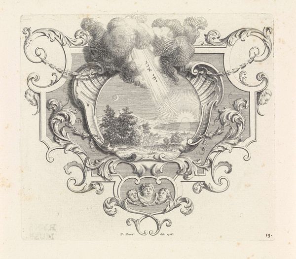 Editor: Here we have "Ornamenteel cartouche met ondergaande zon," an engraving made sometime between 1683 and 1733, attributed to Bernard Picart. It’s at the Rijksmuseum. The scene is beautiful but rather somber with its setting sun and stormy clouds. What’s your read on this engraving? Curator: It is evocative, isn’t it? This cartouche is so much more than a simple decoration. Given its creation during the Enlightenment, it embodies the complex relationship between colonialism, faith, and reason. The setting sun could represent the waning power of the Church, whilst the rising power is alluded to through the laurel, referring to imminent colonial 'conquests.' The cherubs feel forced here. How might the indigenous people who suffered due to colonialism view those angelic figures? Editor: That's an interesting point. I hadn't thought about it from that perspective. I was mostly focused on the art historical aspects, seeing how the Baroque style comes through in the ornamentation and the allegorical imagery. Curator: Precisely, but how might contemporary theory shed new light on these classical interpretations? What does it mean to portray "conquests" so gloriously in light of the historical violence that occurred during this period? Can we disentangle aesthetics from ethics when observing colonial art? Editor: I guess I was viewing the cartouche at face value, focusing on its beauty, but I now understand how important it is to think critically about its historical and social context. To understand it beyond face value. Curator: Exactly! This seemingly beautiful piece becomes a space for reflection and debate once you consider its complicated position within systems of oppression. That way, art history fosters critical dialogue and societal change. Editor: It definitely gives me a lot to think about. Thanks for opening my eyes to the potential of the artwork as a colonial artefact! Curator: It’s by critically confronting the problematic parts of our past that we build a better future!