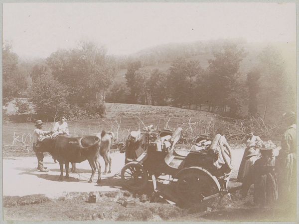 This small photograph, ‘Gezelschap met paardenkar op een landweg in Puy-de-Dôme’ was created by Delizy using the 19th-century technique of chemical photography. The process involved coating a surface with light-sensitive materials; we can imagine the alchemical experimentation involved. The final sepia colour is itself a material effect, emerging from this early photographic chemistry. Looking at the image, one notices the human labour involved in its production. This is made evident in the figures depicted, who are reliant on the work of animals in the pre-industrial landscape. It is of course also manifest in the photographer’s own careful work, in the labour of composing and capturing this image. Consider too, the labour that we no longer see: that which went into the manufacturing of the camera and chemicals. The photograph, then, is more than just a captured moment; it’s an encapsulation of a specific moment in the history of technology and society.