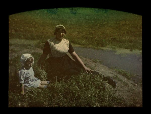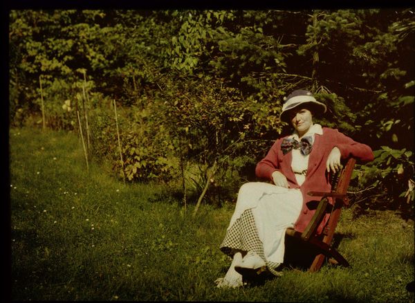 Editor: Here we have Constantin Flórinsky's photograph "Olga Victorovna Dmitrieff" from 1907. It looks like a quiet moment captured in time. I notice the woman is alone, gazing out over a lake in the park, perhaps lost in thought. The natural light gives a dreamlike quality to the whole scene. What do you see in this piece? Curator: Ah, yes, it's like stumbling upon a secret reverie, isn't it? I'm particularly drawn to how Flórinsky plays with light and shadow, blurring the lines between a portrait and a landscape. It reminds me of those fleeting moments in Impressionist paintings, when light itself becomes the subject. Do you think she's waiting, perhaps for a rendezvous, or simply enjoying a solitary pause? Editor: That's a nice image to keep in mind! I hadn’t really thought of Impressionism, but now that you mention it, I see that similarity. Maybe she is waiting, there is something poetic and unfinished about that. Do you think photography in the 1900s let him reach those results more easily? Curator: Precisely! Early color photography was quite the alchemical dance, you know. The fact that he manages to capture such a subtle range of tones is really wonderful. And that sense of immediacy – the idea that this woman was actually there, in that light, at that very moment – is incredibly powerful. Like catching a butterfly with a net made of light. Editor: That's a great way to put it. I suppose it's a very good reminder that even old photography wasn't simply about recording reality, but rather how artists choose to show us what they see. Curator: Absolutely! I will consider all that while admiring the scene, letting this captured moment be more than a photographic document.