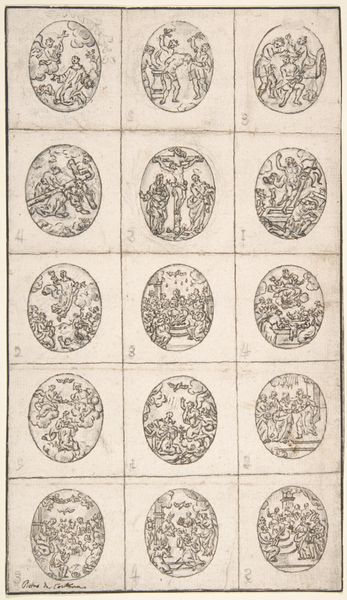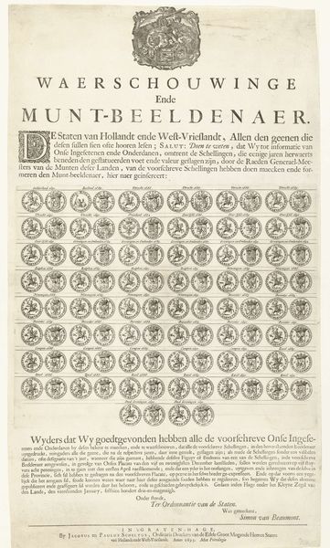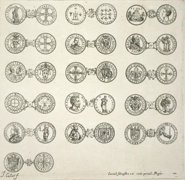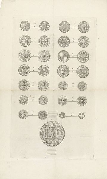 Curator: This engraving from the late 18th century, "Het nieuw uitgevondene divertable ducatonne spel," attributed to S. & W. Koene, is a fascinating example of art intersecting with popular culture. What strikes you about it? Editor: It’s literally a game! It seems like a board game with different coins. It’s almost like collecting, but as a social thing? The detail in each of the coins is very cool. I want to know more, like how does history play into it all? Curator: Exactly! It’s all about history, as it appears printed with instructions for a coin-based gambling game, probably circulated among a specific social class interested in numismatics and maybe political intrigue. Each coin, a ducatonne, likely held symbolic weight related to historical events or figures, giving players a chance to "play" history but shaped and contextualized through the Dutch Republic in the 1780-90s and whatever message the creators hoped to convey or profit from in that tumultuous era. What do the instructions at the bottom tell you? Editor: Well, I see the words "Hollandiche Tuin" and what looks like player instructions. The print is hard to read...I’m not sure. Curator: The instructions situate it within contemporary society of the time. Analyzing such artworks, we delve into the cultural context, tracing how economic activities, social values, and even entertainment were shaped by political and social conditions. It humanizes art and teaches us that seemingly simple creations carry historical significance, unveiling truths about social roles and cultural practices of bygone eras. Does thinking of it as a "social" art makes you see it differently? Editor: I guess so! It is no longer just pictures of coins! Seeing the historical background adds new dimensions to what seems like an antiquated form of play. It kind of reminds you that art wasn't just about fancy paintings hung up high, but existed everywhere in culture. Thanks!