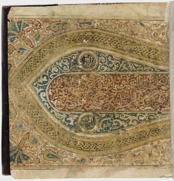 Curator: This captivating work is a double page from a manuscript of Yusuf and Zulaikha of Jami, created sometime between 1550 and 1599. The text itself is by Maulana Nur al-Din `Abd al-Rahman Jami, a famous Persian poet. The manuscript page, now housed at the Metropolitan Museum of Art, uses ink, water colours, and gold on paper. Editor: Oh, wow. My immediate impression is…jeweled. It’s like looking into a box filled with tiny, glittering ornaments. But also, somehow calming? The blue is such a cool counterpoint to all that shimmering gold. Curator: That "jeweled" quality is something the artists of the time clearly strived for. We have to remember the social context—these manuscripts were commissioned by royalty, by the elites of their day. Displaying wealth and sophistication through artistic patronage was essential. These stories offered not just aesthetic beauty, but acted as important cultural vehicles to shape morality. Editor: So it was like the Instagram of its day, a carefully curated presentation of aspiration! You know, looking closer, I love how the patterns dance but don’t overwhelm. It's meticulous without feeling rigid. The way the text, though I can’t read it, sits in the center like a precious thought… it's beautiful. Curator: Precisely. The Nasta'liq script itself is highly regarded for its elegance and fluidity, becoming a core form of cultural expression and identity. These design choices are hardly random, but deliberate choices. Also, remember, the story of Yusuf and Zulaikha itself touches upon universal themes—love, desire, devotion—with endless potential for interpretations around gendered expectations of power. Editor: It’s incredible how much is communicated, even if you can’t decipher every single element. There’s a spiritual quality, definitely. Makes me think of… loss and longing, actually. Perhaps the desire for something just out of reach, like trying to understand an ancient story, from our time. Curator: I completely agree. Considering this artwork, it urges us to consider the powerful interconnections of cultural and social history. We can view the aesthetics not merely as artistic expression, but to unravel this relationship by revealing the social values of the past. Editor: It's wild how a simple book page can hold so much history, artistry, and emotional resonance! This gem gives a glimpse into stories from centuries ago, all while managing to whisper secrets to my own soul, which is enough to ignite creative visions, if you let it.