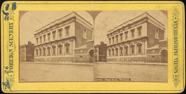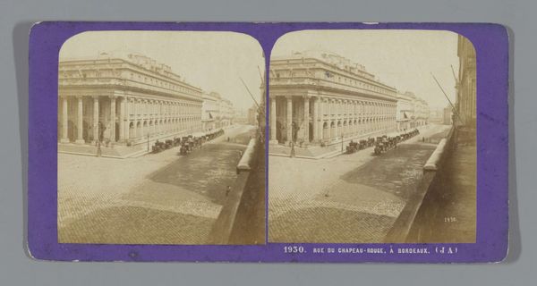 Curator: Before us is a stereoscopic photograph taken by Jean Andrieu sometime between 1862 and 1876, titled "Exterieur van het Paleis van Justitie te Bordeaux"—Exterior of the Courthouse in Bordeaux. What are your initial impressions? Editor: My first thought goes to the texture; I immediately see the weight of the stone contrasted against what must be the cobblestone street and cast-iron fencing. It’s about structure, isn’t it? Very material. Curator: Absolutely. But it's not just about material presence; consider the late 19th-century context. Courthouses, particularly in France, symbolized civic order and state power—institutions often built atop pre-existing power structures that marginalized various groups. So this image raises the question: who has access to justice and on what terms? Editor: And I’d add: By what means was this monumental structure fabricated? I want to know about the labor involved, from quarrying to construction. This is a photograph, so what was the process involved in its production? It makes me think about access to art, too—who is the presumed viewer of these stereoscopic cards? Curator: Exactly. Stereoscopic images were a technology intended for broad distribution but they certainly spoke to a burgeoning bourgeois audience. What did they seek to extract, to consume, from images of institutional power and architectural grandiosity? I think this image can be interpreted through Foucault's concepts of power. The imposing facade is more than architectural; it embodies disciplinary power, visible but intangible, that seeks to shape societal norms and behaviors. Editor: Thinking materially again, consider how architecture shapes the city and daily life. It’s not merely a backdrop, but actively shapes it by the use of resources, its sheer physical presence… Curator: Indeed. This photograph reveals how spaces are politically charged and layered with symbolism that touches upon identity and power. Editor: So from raw materials to the final commodity viewed in someone's parlor…it’s all interconnected. Interesting to consider. Curator: A beautiful way to approach this image—revealing how the threads of history, representation, and lived reality entangle. Editor: A nexus of materiality and ideology—an architectural portrait that invites more than one interpretation.