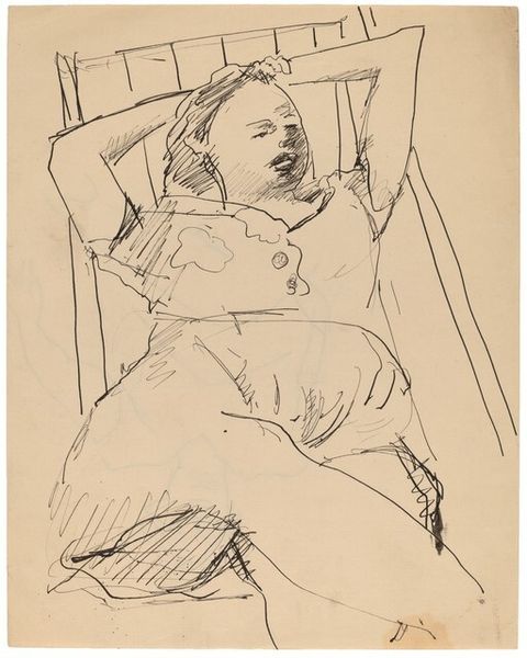Curator: Let's talk about "Woman Reclining on Slatted Lounge Chair." It’s rendered in what seems to be ink on paper. A study in repose, a line drawing of a figure caught mid-daydream perhaps? Editor: Oh, I love that. Mid-daydream is spot on. There's something so unpretentious about the sketch, like a little secret peek into someone's ordinary afternoon. I am quite fond of this slatted lounge chair. Is it modernist? Bauhaus, maybe? Curator: You know, while it has a modernist feel, the actual setting and even the dating of this drawing are unclear. This intimate sketch offers a glimpse into an artist's observation of daily life, likely drawn directly from life. There’s this sense of immediacy captured by simple lines and fluid strokes of a pen. I feel like the figure and setting get stripped bare, without unnecessary decorum, letting their shapes fill the canvas, so to speak. Editor: Precisely! And I find that simplicity so engaging. You look at the shapes defining the reclining figure, the slight asymmetry... it all feels wonderfully real and unposed. Almost daring. This has nothing of bourgeois respectability. Instead, you are reminded that human form takes all types. Curator: I think you make an astute point. How the figure almost defies those strict, idealized forms… There is this looseness about the subject that makes it extremely contemporary for my taste. She claims ownership of herself! And perhaps the choice to employ something as unstudied and raw as pen and ink plays into it all? A sort of protest against convention even if it simply serves as visual record. Editor: Yes, that’s it! A visual record—a protest almost—against artifice. I love how you phrased that. It seems like the artist, pen in hand, says: this is it! This is the woman, this is her moment! Curator: Exactly! You and I seem to find something deeply personal in that bold declaration of 'this is it'. I like to imagine encountering her in some chic café in the Village back in the day, radiating nonchalant confidence as the artist draws away at her. Editor: Oh, that image is too charming to pass up! Next thing you know we have Rothko, rather accidentally, capturing a quiet revolt. Well, accidentally or not, thank goodness we are witnesses today.