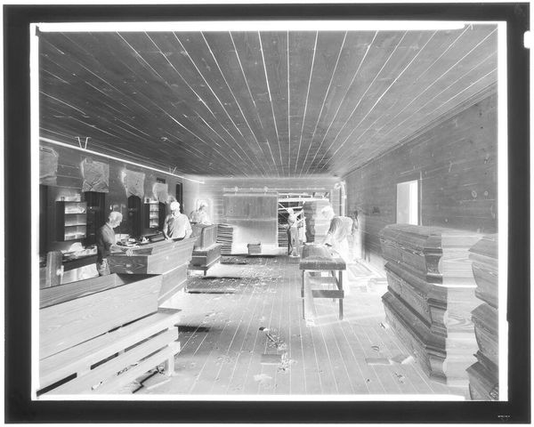 Editor: This photograph by Hamblin Studio, titled "Untitled (craftsmen working at Woodward Casket Co.)", captures a historical moment. The repetition of the caskets is eerie. What do you see in this image? Curator: Notice how the caskets, symbols of transition, are meticulously crafted. Their construction mirrors a cultural ritual, where grief and remembrance are literally shaped by human hands. Editor: So, the image holds layers of cultural meaning? Curator: Precisely. The craftsmen, almost faceless, become archetypes. The photograph captures not just an industry, but a societal relationship with mortality. What emotions does this evoke in you? Editor: A sense of inevitability, yet also care. It's thought-provoking how symbols can transform our understanding. Curator: Indeed, the image reveals how even in death, there is a continuity of cultural memory.