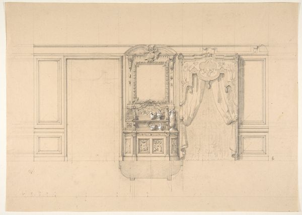Curator: Okay, let's talk about Abraham Meertens' "Design for Room Decoration with Two Panels with Seascapes," dating from 1767-1823. Editor: What strikes me about this piece is its formality, despite being a preparatory drawing. The balance and symmetry create a calming, almost stately mood. It’s a rendering of an interior, but one focused on a curated vision of nature through the landscape panels. What are your initial thoughts when you look at this design? Curator: You’ve hit on something key there: curated nature! It’s funny, isn't it? To frame, quite literally, an experience of nature within the confines of a very specific aesthetic. Think about it - these aren't wild, untamed seascapes; they’re neatly contained within a Neoclassical framework. It’s about control, order, and a very particular ideal of beauty, which are all core to the period. Do you notice how the marine themes integrate the classic structure of the architecture? Editor: Yes, the panels depicting seascapes almost mimic framed paintings hung within a structured room. What does that say about how they viewed nature at that time? Was it something to be admired from a distance, a decorative element within their controlled environment? Curator: Exactly! I mean, the drawing suggests that. These were less about roughing it in nature, more about enjoying it from the comfort and safety of a well-appointed room. There’s a real sense of refinement here. I'm struck by the inherent artifice—nature tamed and turned into decoration. So what do you think you’ll take away from observing Meertens’ work here? Editor: The realization that art isn't just a reflection of the world; it’s a carefully constructed interpretation shaped by the values and desires of its time. And maybe a newfound appreciation for venturing outside instead of just admiring seascapes on a wall! Curator: I completely agree, I wonder what would be decorating my wall. Thank you.