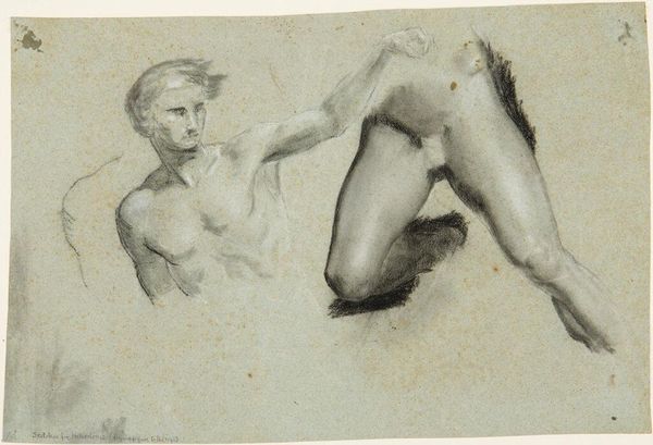 Editor: This is "Naakte zittende man," or "Naked Sitting Man," a pencil drawing by Henricus Wilhelmus Couwenberg, made sometime between 1829 and 1845. There’s a vulnerable quality to the figure. What do you see in this piece? Curator: I'm drawn to how the artist explores classical ideals through this figure. The multiple iterations of the head create a sense of the subject being caught between thought and reality, reflecting perhaps an inner dialogue or struggle. Notice the realistic details: they serve to ground the image, but there’s a timeless quality, don’t you think? Editor: Absolutely. The shadows emphasize the muscularity, bringing an ancient statue to life. I'm curious, does the nakedness carry any specific symbolism here, beyond the classical allusion? Curator: Nakedness often signifies vulnerability, but also a return to origins. In classical art, the male nude was used to depict heroes and gods, idealizing the human form. Here, I sense both—a man stripped bare, but also imbued with an almost heroic quality through the meticulous detailing of his physique and that haunting repetition of the head, which echoes throughout the history of religious imagery. Do you feel it communicates some form of emotional burden or striving? Editor: I do see that now, especially with those ethereal repetitions. I hadn't considered the duality of vulnerability and heroism so explicitly. It’s like the artist is trying to capture something beyond the physical. Curator: Precisely. By subtly layering symbolism, the artist asks us to consider what it means to embody ideals, and the internal complexities involved in such an aspiration. It really becomes more than just a drawing, but an exploration of humanity’s timeless pursuits. Editor: I never thought I'd see so much depth in what seems like a simple sketch. Thanks for sharing your insight. Curator: My pleasure. It’s always rewarding to find the enduring power of symbols, even in the most seemingly unassuming of images.