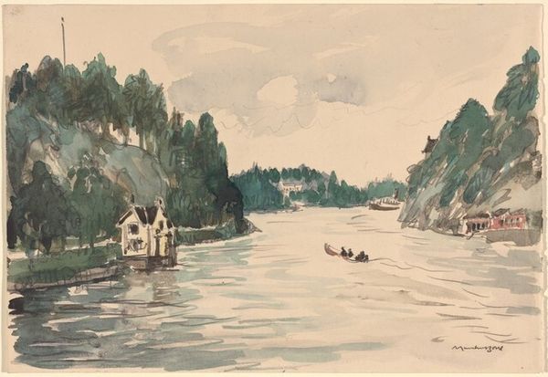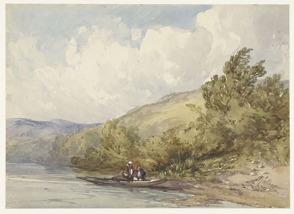 Curator: Winslow Homer's "Adirondack Lake (Blue Monday)" presents a contemplative scene. The cool blues and greens evoke a sense of tranquility, don’t they? Editor: Indeed, but I'm drawn to the canoe itself. The texture of the wood seems palpable; you can almost feel the labour of shaping it. What does it tell us about leisure and recreation in that period? Curator: The reflection of the canoe and figure in the water adds depth, almost creating a doubling effect that complicates our reading of the scene. The fisherman seems isolated. Editor: Precisely, isolated, yet intimately connected to the means of sustenance and the natural world. What's the embodied experience of this fisherman, dependent on hand-crafted implements, amidst this landscape? Curator: Perhaps Homer invites us to consider the interplay between humanity and nature, articulated through his masterful use of watercolor. Editor: It’s a potent reminder of how tools shape our experience and relationship with nature.