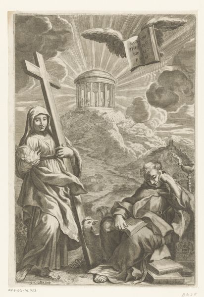 Curator: This is the title page for Leo of Ostia's "Chronicon Casinense," an engraving made sometime between 1633 and 1692 by Cornelis Bloemaert. What are your first impressions? Editor: Well, it strikes me as quite melancholic, bathed in a somewhat severe, spiritual light. There's a strong diagonal composition at play. A woman with a cross on one side, a scholar appearing weary, even asleep, on the other, both under this… luminous cityscape in the distance. Curator: Precisely. Notice the clear linearity of the engraving, a hallmark of Bloemaert's style and the Baroque period in general. It allows for incredible detail. Editor: But also allows us to consider the politics inherent in its construction. The figure carrying the cross—clearly representative of faith and penance, positioned so close to that rooster, symbolising vigilance but also masculine authority. This contrasts with the drowsy, intellectual male, perhaps a comment on the perceived roles of men and women, faith versus intellect in disseminating truth at the time. Curator: A valid interpretation. However, consider the symbolic language: the flying book is inscribed with the chronicle’s title, visually declaring itself. The lines emanating from the heavenly city underscore the book’s divine origin. This speaks to a well-honed system of visual rhetoric, designed for an educated 17th-century viewer. Editor: Rhetoric inextricably linked to power, though. It's difficult to ignore the fact that history, especially as presented in such a context, often serves the interests of the ruling class. A literal history painting reinforcing established norms. The cityscape elevated, unattainable to the every person. Curator: I see your point about the representation, although one can’t deny Bloemaert's technique. The density of lines creating depth, the balance achieved despite the overt symbolism. It’s a visually compelling piece regardless. Editor: Absolutely. And maybe the artist’s mastery gives it lasting potency, to get us questioning these dynamics of power, even centuries later. Curator: A final point, perhaps. Bloemaert has successfully produced an engraving which remains, if nothing else, extremely evocative, from its material creation through its composition. Editor: Indeed. It serves as a potent artifact prompting questions about history, gender, faith, and, of course, representation itself.