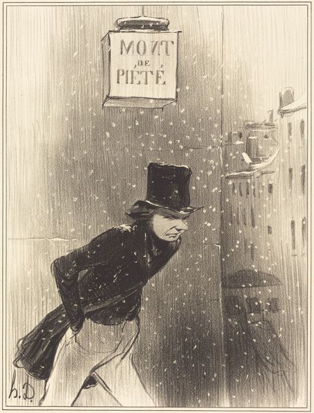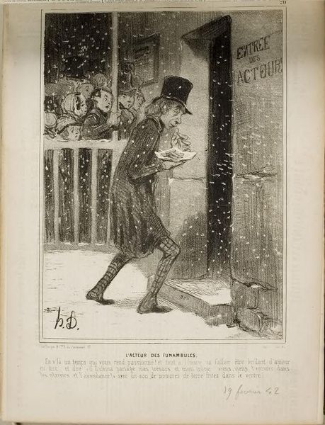 Curator: It’s striking, isn’t it? I feel an immediate chill just looking at it; the figure is swallowed by the swirling snow, so desolate. Editor: That's precisely the emotional power Daumier captures so well. We are looking at Honoré Daumier's 1842 lithograph titled "L'Acteur des Funambules," or "The Actor of the Tightrope Walkers." It’s more than just a cityscape; it is social commentary, really. Curator: A city transformed by Romanticism, or is that an actor trying to enter what looks like a building. I notice the stylized pencil-sketch quality—the print emulates this, as do other images in old engravings, as well. The man's posture and even his tight leggings are, I'd guess, designed to amuse. I imagine these features are more poignant than laughable in actuality, wouldn't you say? Editor: Absolutely, but to elaborate on that context: Daumier uses caricature, particularly evident in the actor’s exaggerated features, to critique societal inequities. Here he is heading toward a "Actor's Entrance," we can only imagine what kind of reception he is getting, when those inside and those peeking from the balcony upstairs appear warm and cheerful, maybe a little jeering. Curator: Caricature does seem essential to grasping his intent here—and looking back at how consistently Daumier returned to theater themes offers insight into how performance reveals or conceals social tensions. Editor: Yes, his art forces us to examine the realities concealed beneath entertainment, making "The Actor of the Tightrope Walkers" not simply a portrait but a reflection on the economic hardship and marginalization experienced by performers of that period. It makes one wonder, where does the acting end and true sentiment begins in his countenance? Curator: The piece feels much heavier now, understanding Daumier's drive to bring these often unseen, unspoken truths to light. The image, almost dreamlike to me, feels less rooted in performance itself and more in its social reality. Editor: Indeed; it encourages critical perspectives. We're no longer mere spectators, but active participants in recognizing the sociopolitical narratives Daumier deftly embedded within the aesthetic beauty.