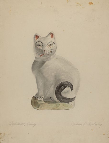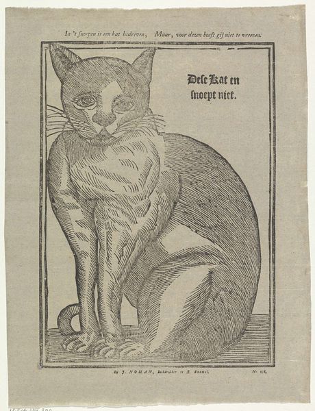 Editor: This is a charming engraving from between 1725 and 1780, titled "De Katte is" by Johannes Kannewet. It’s a very simple image of a cat. There's something so direct and almost childlike about its depiction. What stands out to you when you look at this print? Curator: What immediately grabs me is the explicit link to commerce; look, it says Kannewet was a bookseller! Prints like these weren’t just art objects. They were a form of public communication, meant for circulation and consumption, not necessarily destined for a gallery. This kitty likely adorned the homes of everyday people. Does that alter your perspective? Editor: Definitely! It makes me think about who might have purchased this and why. Was it meant to be humorous? Educational? Curator: Exactly! The Dutch Golden Age had a booming print market. Prints weren't isolated things, they existed within a system of production and distribution, often reflecting broader societal values or providing commentary. The text above the image -- have you deciphered it? It mentions the cat wants a fish but won’t forget the mice! So, allegorically speaking, what could the fish and mice signify to that audience, and how might it impact the reading of this illustration? Editor: I suppose it suggests a dual threat... the cat embodies a sense of impending peril for different potential "preys." I hadn’t considered that at all, focusing solely on the image itself. Curator: Context shapes how we read an image, and how that image participates in shaping public perceptions and sometimes solidifying specific perspectives. Even simple illustrations like this contributed to the visual landscape of the time. Editor: So, it’s not just a cute cat drawing; it's a window into the world of 18th-century Dutch society! I’ll never look at an old print the same way. Curator: Precisely! Art is always more than just the object itself; it is also the set of social, historical and sometimes, institutional dynamics.