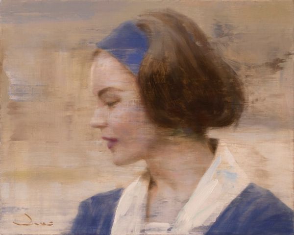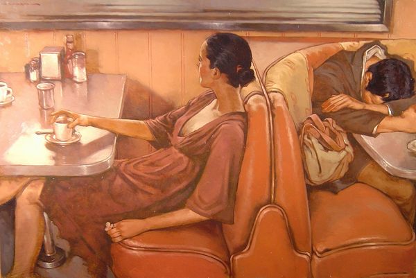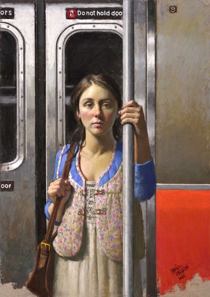Curator: Here we have Nick Alm's 2019 oil painting, "Subway Geisha." Editor: My initial impression is one of disquiet. The subjects, while rendered with undeniable skill, appear strangely detached and almost melancholic. There is a stark contrast in tonal values from the coats, to the figures' skins, to the background. Curator: That sense of unease, I think, arises from the artist's manipulation of several historical tropes. Alm presents a modern subject through a lens that evokes classic portraiture, while the "geisha" reference hints at cultural appropriation and exoticism—practices increasingly under scrutiny. Editor: Interesting, I see that now. Focusing on form, note the repetition of lines and shapes; the rectangular subway windows mirroring the figures' coats create a structured composition. The vertical lines emphasize the confinement and the lack of individual expression, suggesting a loss of self in a system. Curator: Exactly. These visual echoes underscore a larger commentary on conformity within urban environments, perhaps reflective of a society driven by aesthetics. One might observe the historical portrayal of women in public spaces, usually to emphasize ideas such as virtue or the role of "woman" within the industrial society. Alm turns this tradition upside down by allowing these modern female subjects a somewhat sinister presence. Editor: Let's not forget how painting itself historically allowed only certain viewpoints to flourish—usually a male or upper-class viewpoint, defining much of the world through one very restrictive set of experiences. By setting his contemporary portraits within what feels almost like a classical context, the artist invites dialogue around access, status and seeing. The subjects seem so lost. Curator: That’s a pertinent point. It shows how the contemporary perspective offers an opportunity to reappraise canonical expectations within the social arena, offering a far more dynamic set of conclusions. The overall image really compels one to reconsider how these forms interact, revealing tensions that resonate deeply. Editor: Ultimately, "Subway Geisha," both rewards aesthetic contemplation and prompts insightful analysis around the social forces constantly shaping artistic endeavor, forcing our viewers, as they depart, to do so critically and mindfully. Curator: And perhaps, to see the world around us with renewed sensitivity. Thank you.