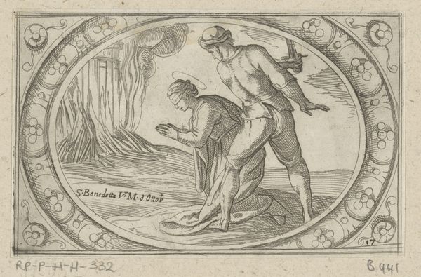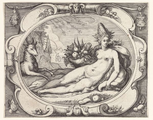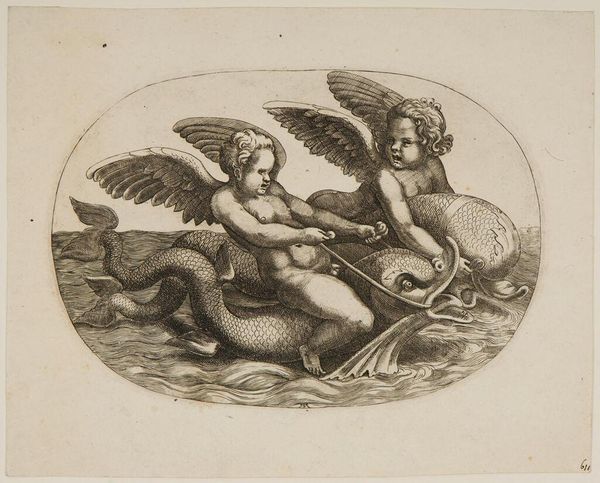 Editor: This is "Venus" by Odoardo Fialetti. It's an etching, and I'm immediately drawn to the contrast between the detailed figures and the more abstract background. What catches your eye in terms of composition? Curator: Note the strategic use of line – how the density and direction create form and volume. Observe also the relationship between Venus and Cupid, how their poses create a visual and implied narrative. Do you discern a tension between the ideal and the real here? Editor: I see what you mean about the line work! The way it defines the musculature is impressive. Maybe the tension comes from the contrasting textures – the smooth skin versus the almost chaotic background hatching? Curator: Precisely. The artist employs these formal elements to create a dynamic, engaging composition. The linear quality, its very graphic nature, invites us to decode the language of the image. A successful work in its execution. Editor: It's fascinating how much can be communicated simply through line and form. Thanks for pointing out the subtleties. Curator: A pleasure. The exercise of close visual analysis always yields new insights.